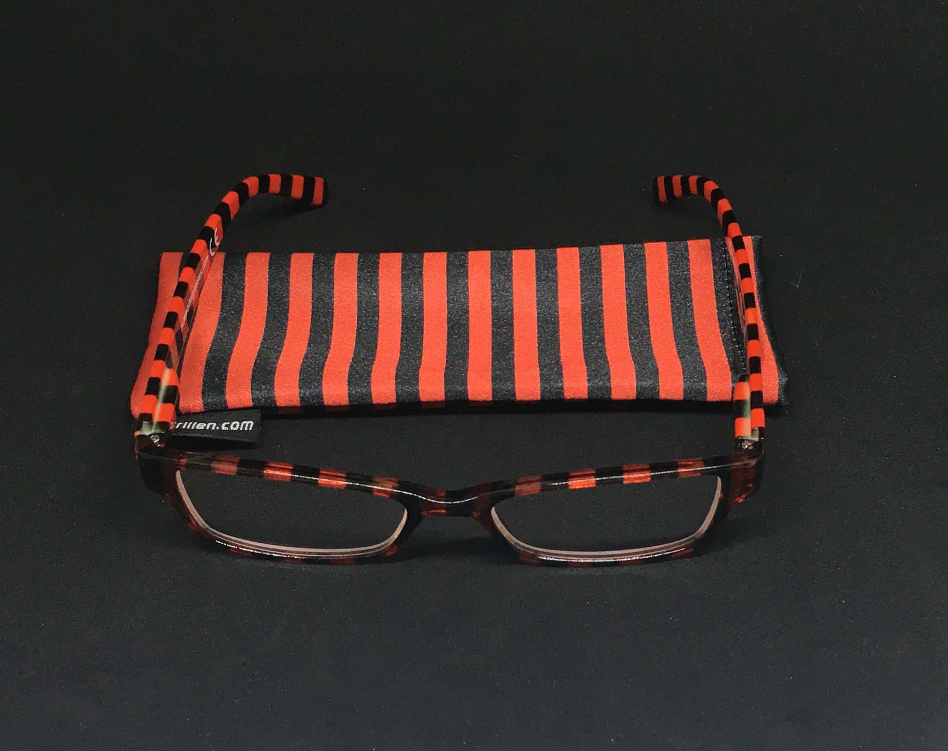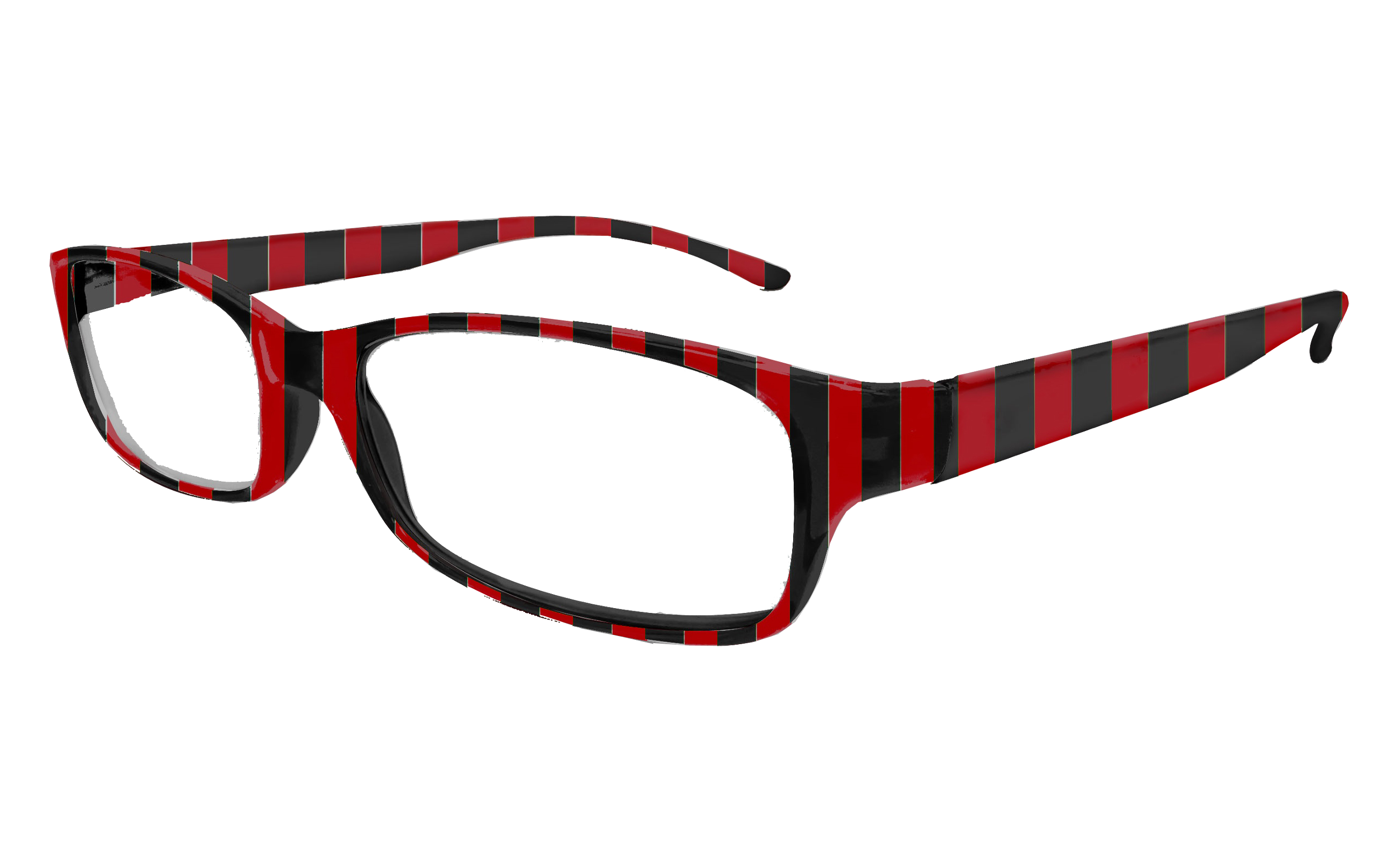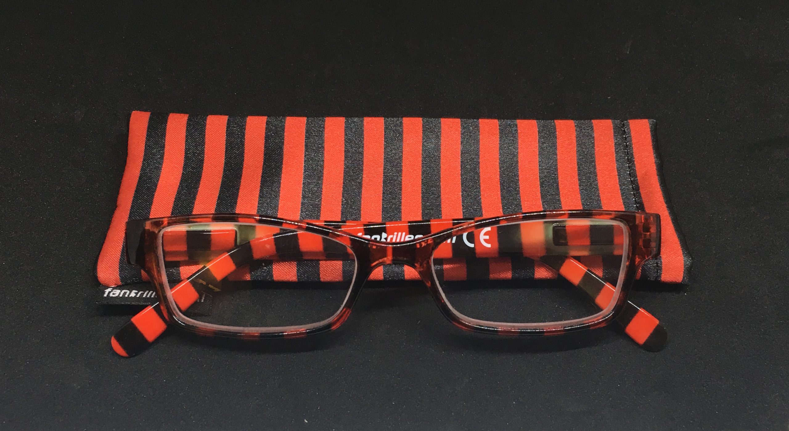 Hochwertige Lesebrille im Blockstreifen-Design in schwarz-rot aus Kunststoff, erstklassig verarbeitet. Ausführung unisex. Lieferung inkl. Brillen-Beutel aus Mikrofaser im gleichen Design.