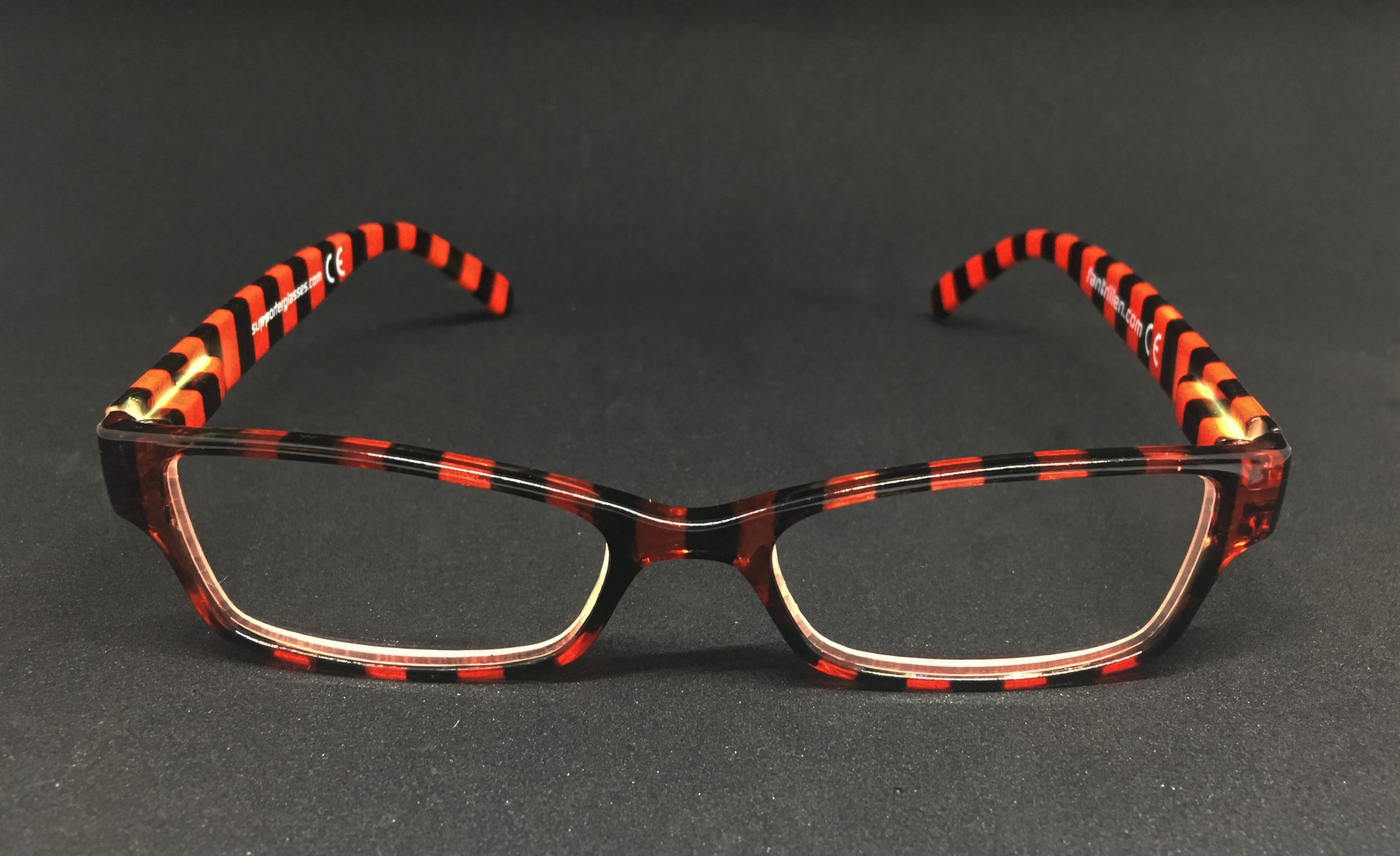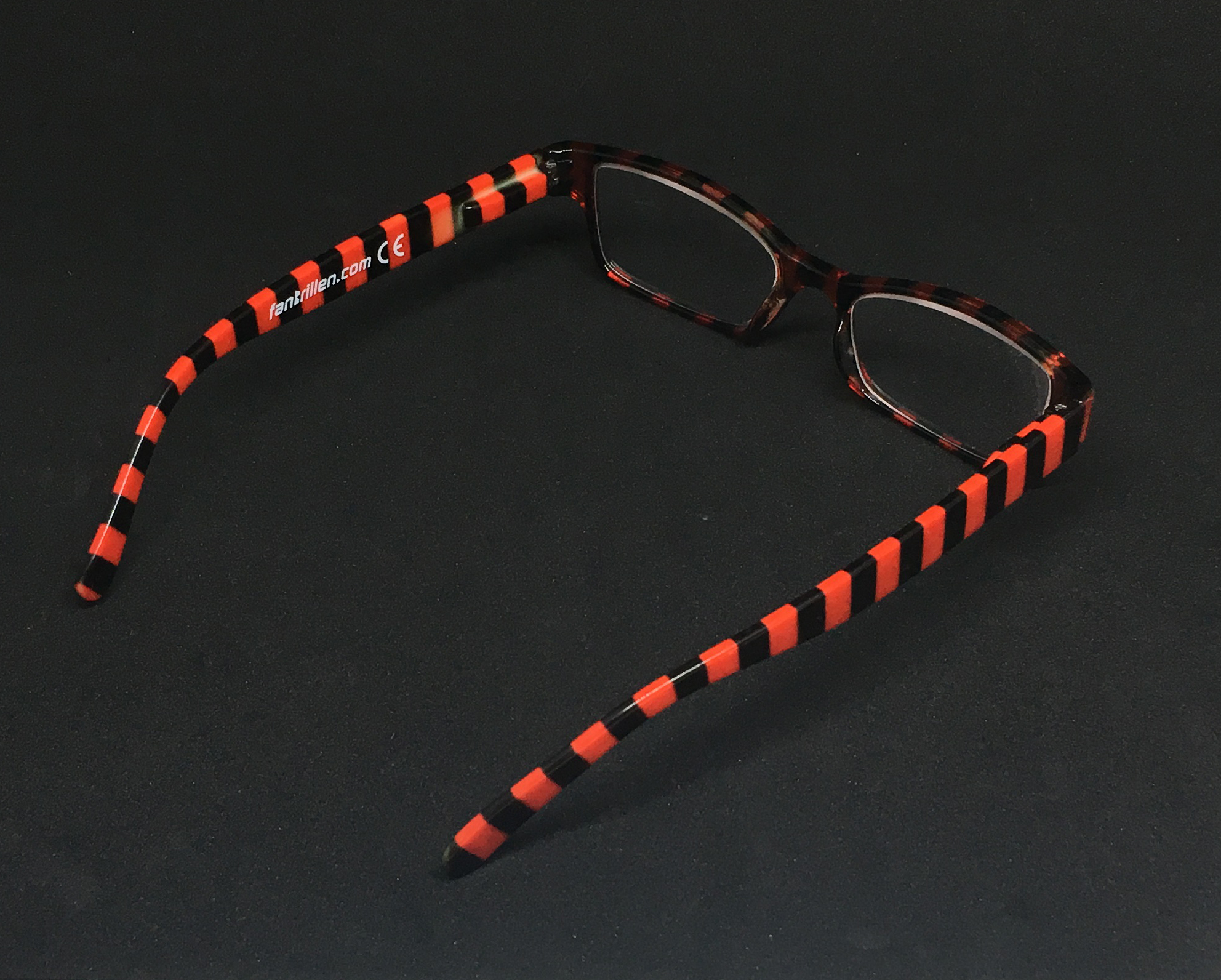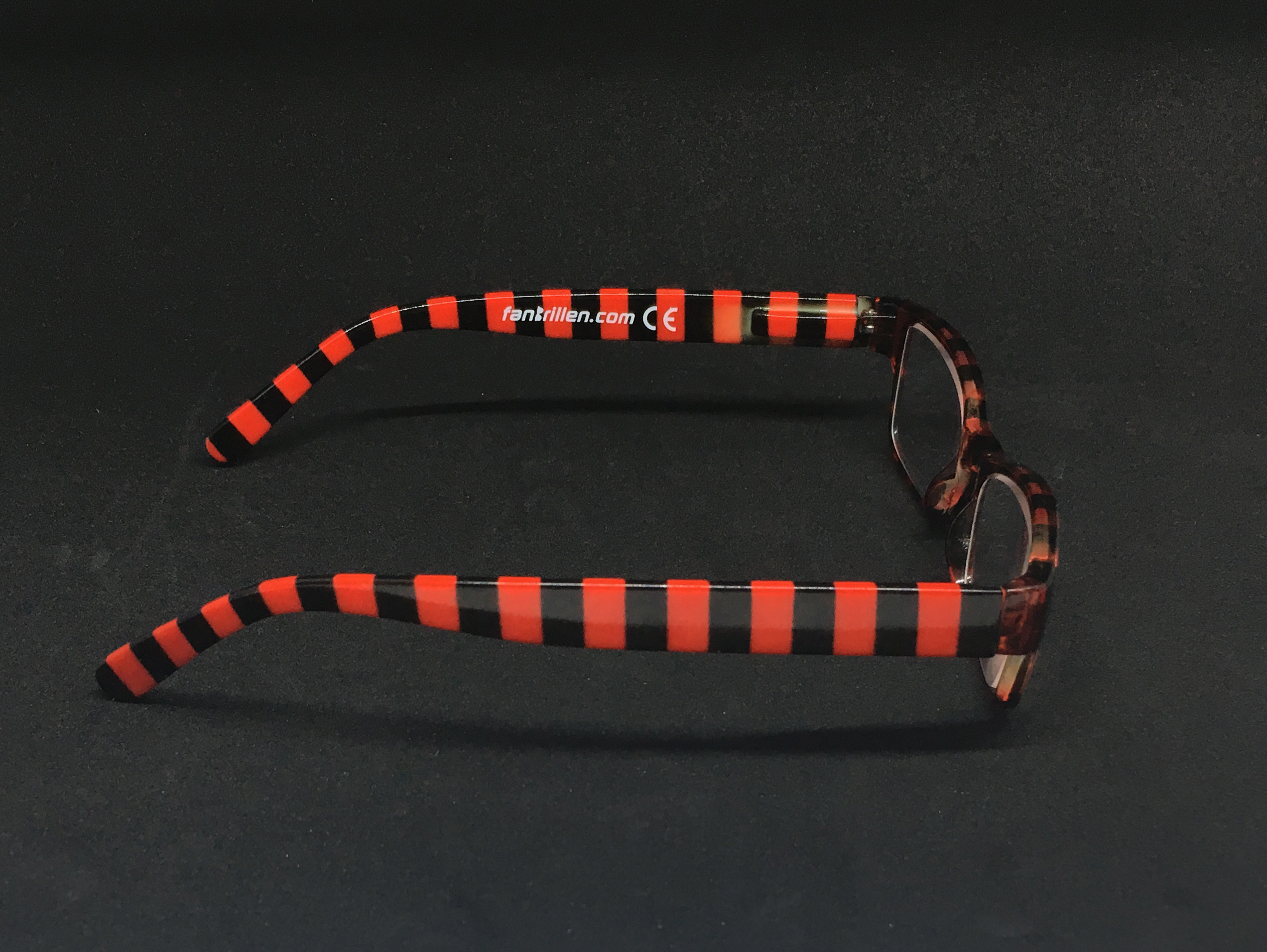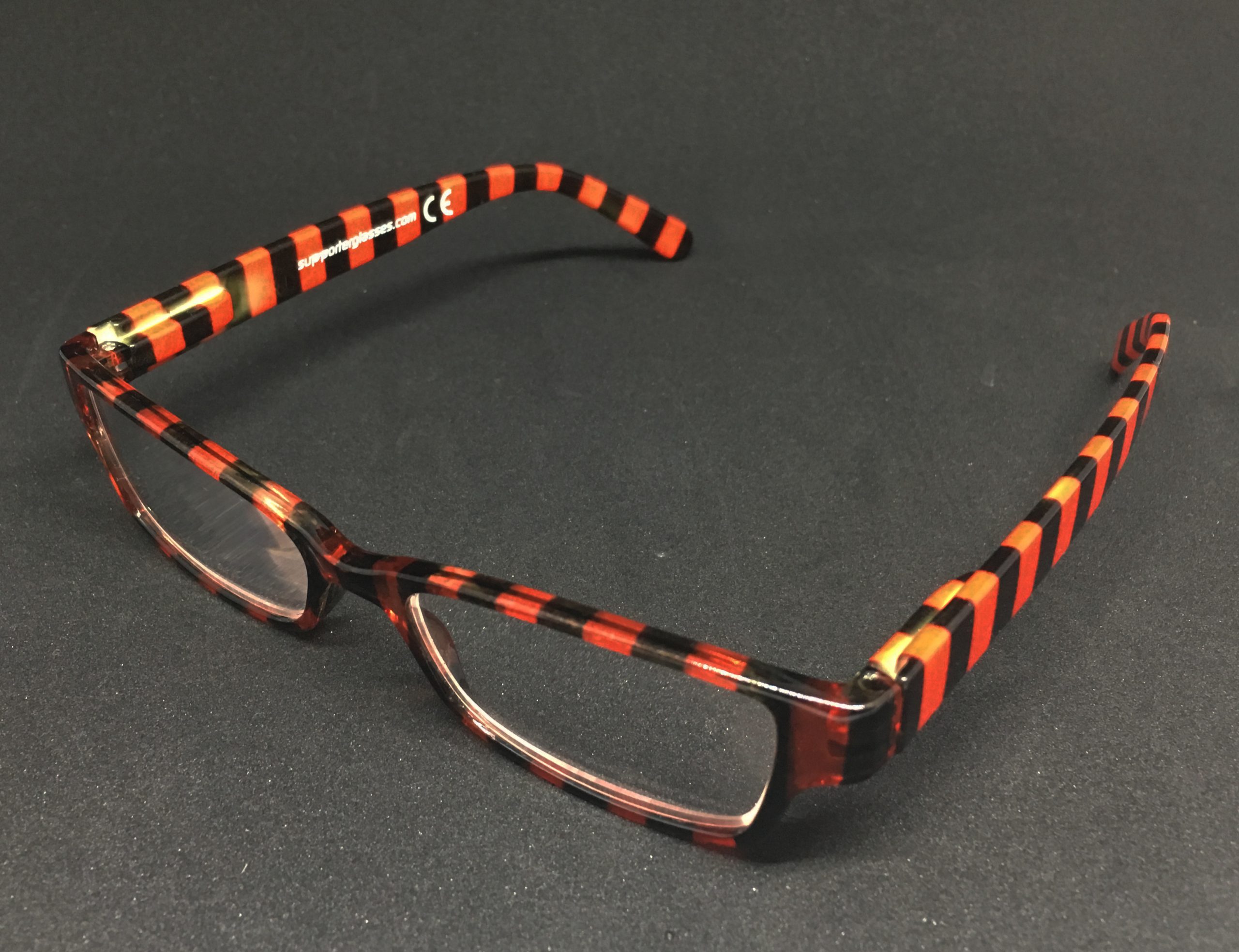 Hochwertige Lesebrille im Blockstreifen-Design in schwarz-rot aus Kunststoff, erstklassig verarbeitet. Ausführung unisex. Lieferung inkl. Brillen-Beutel aus Mikrofaser im gleichen Design.