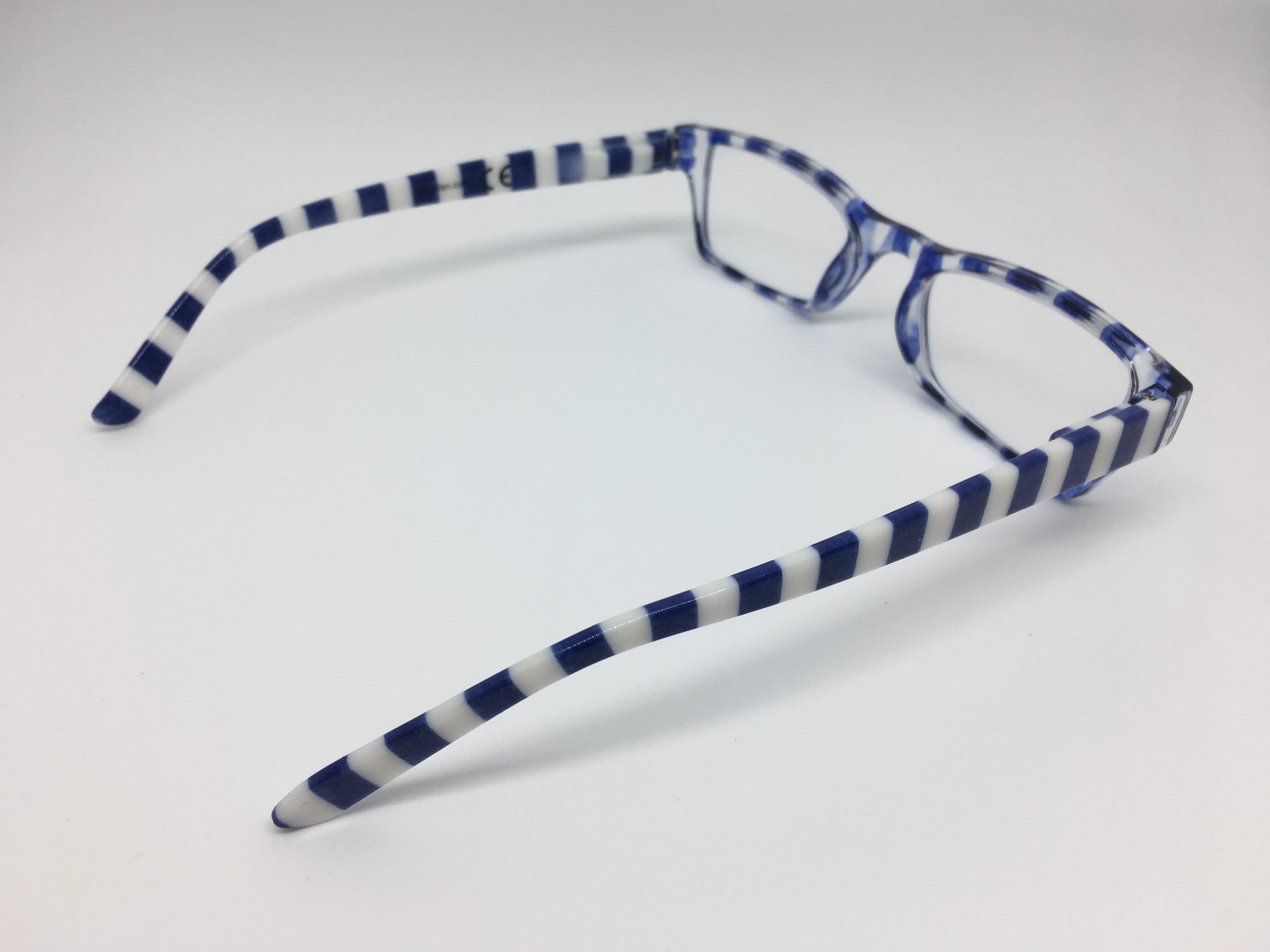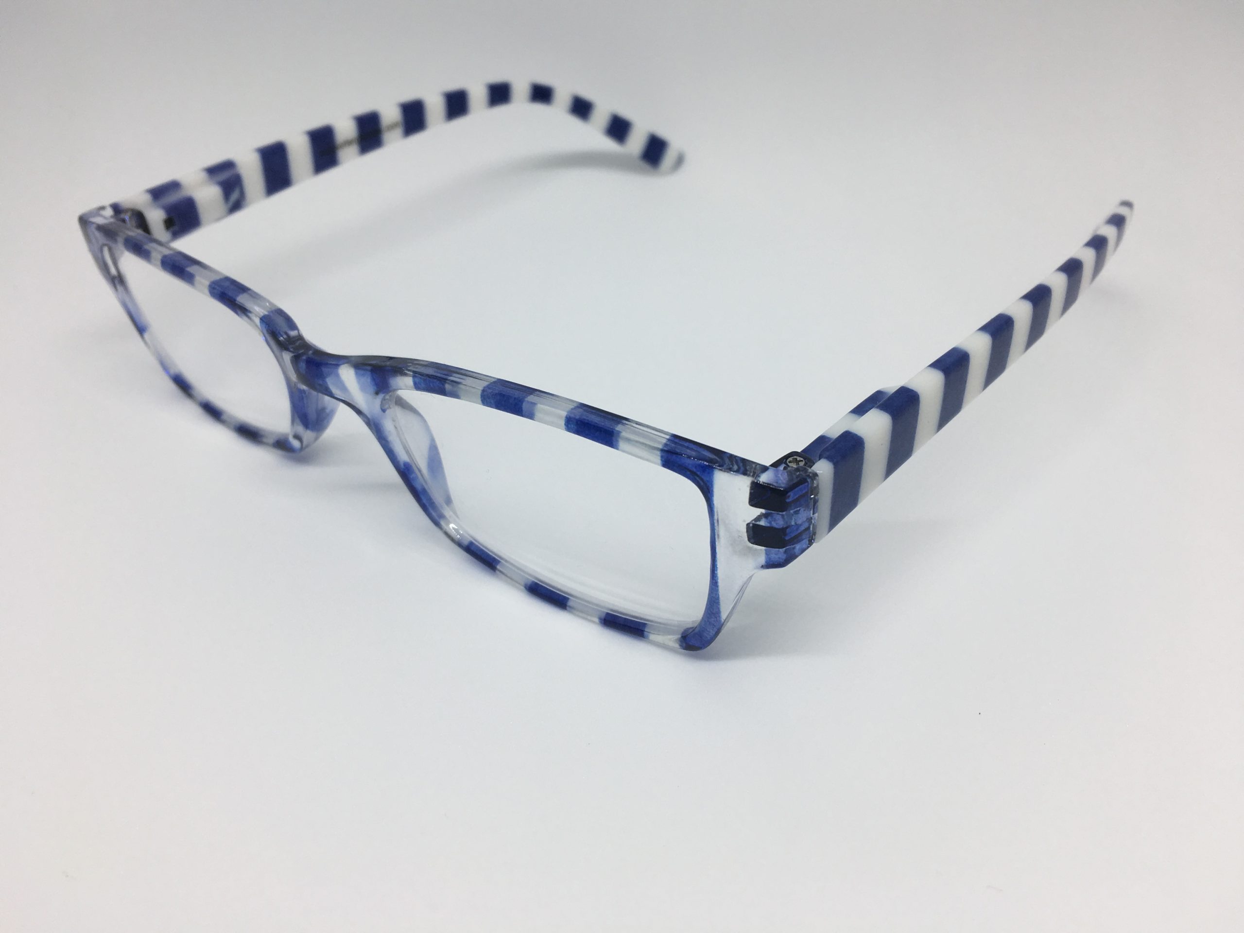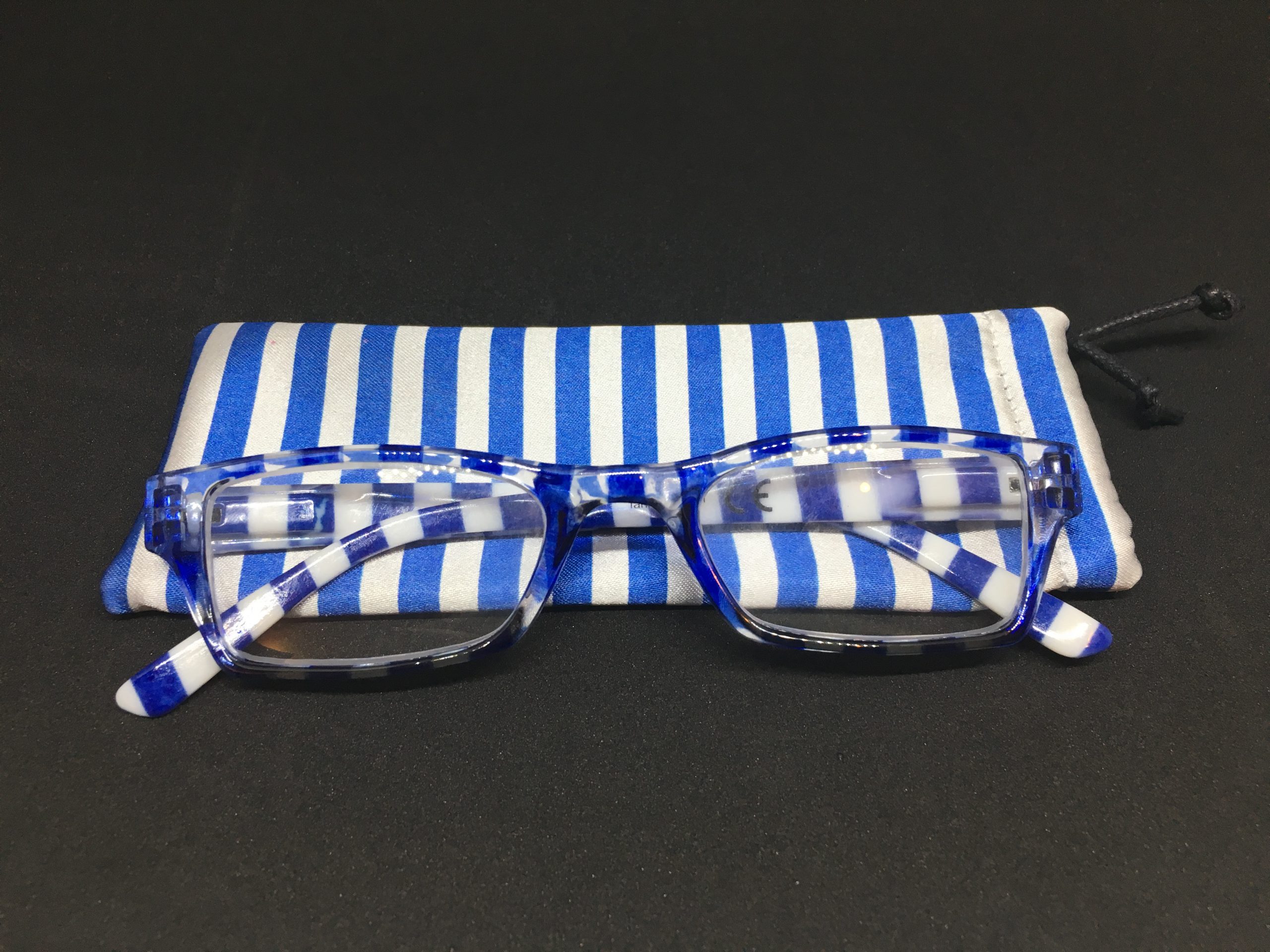 Hochwertige Lesebrille im Blockstreifen-Design in blau-weiß aus Kunststoff, erstklassig verarbeitet. Ausführung unisex. Lieferung inkl. Brillen-Beutel aus Mikrofaser im gleichen Design.