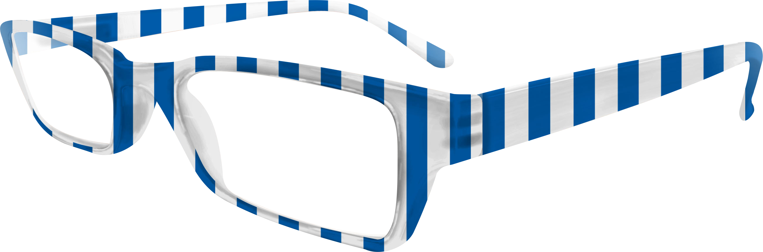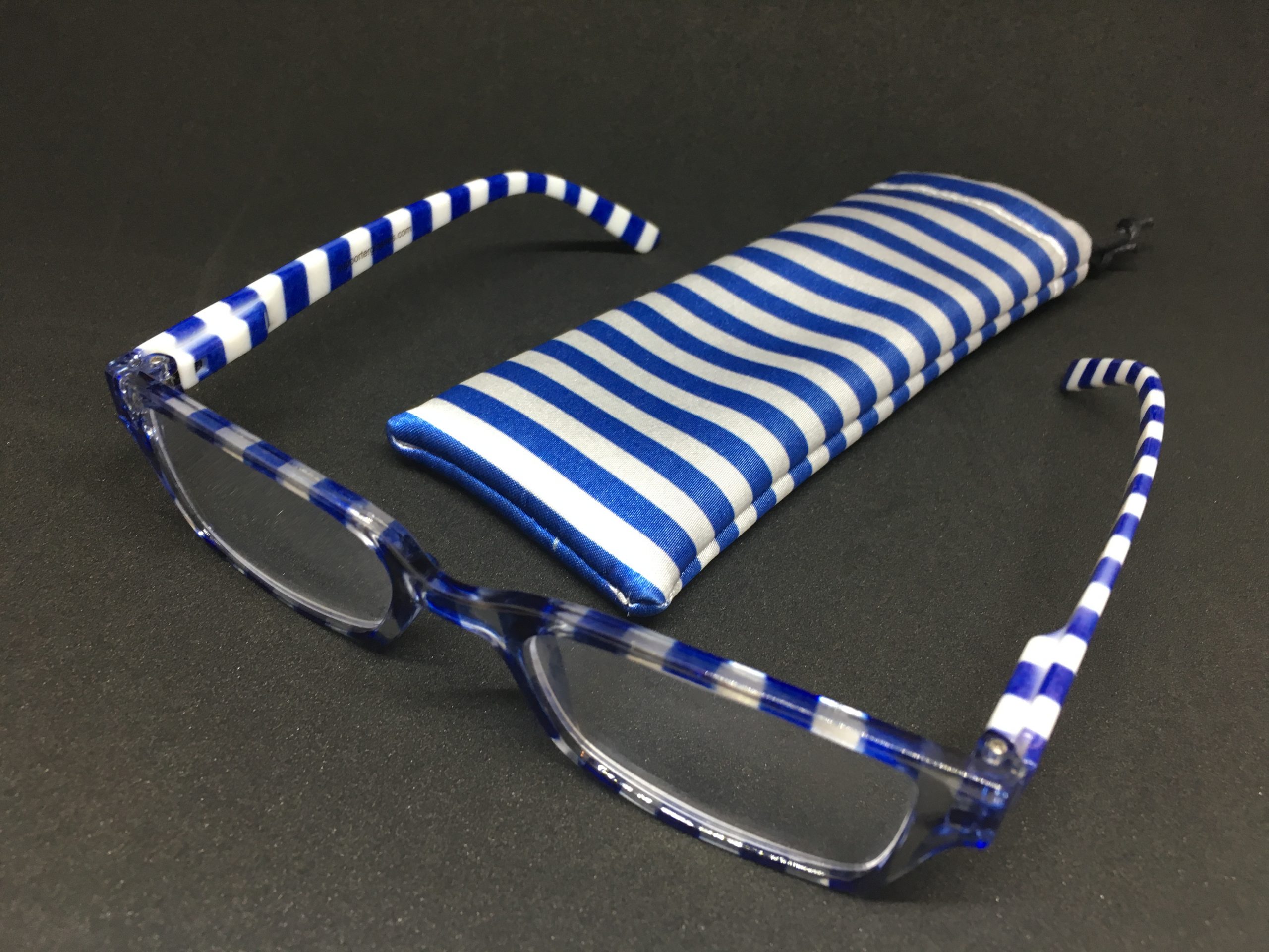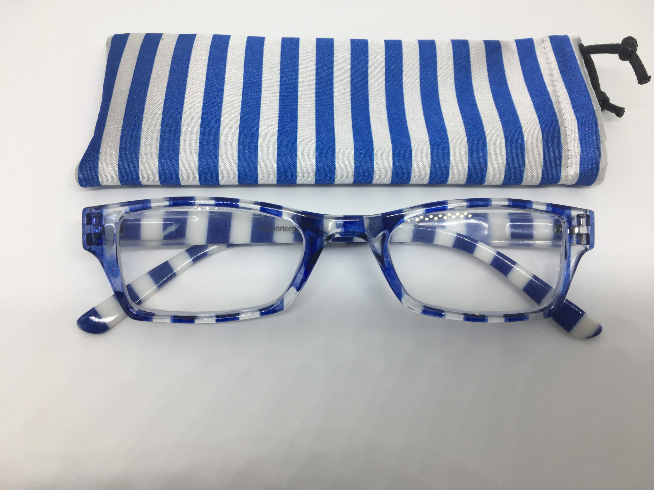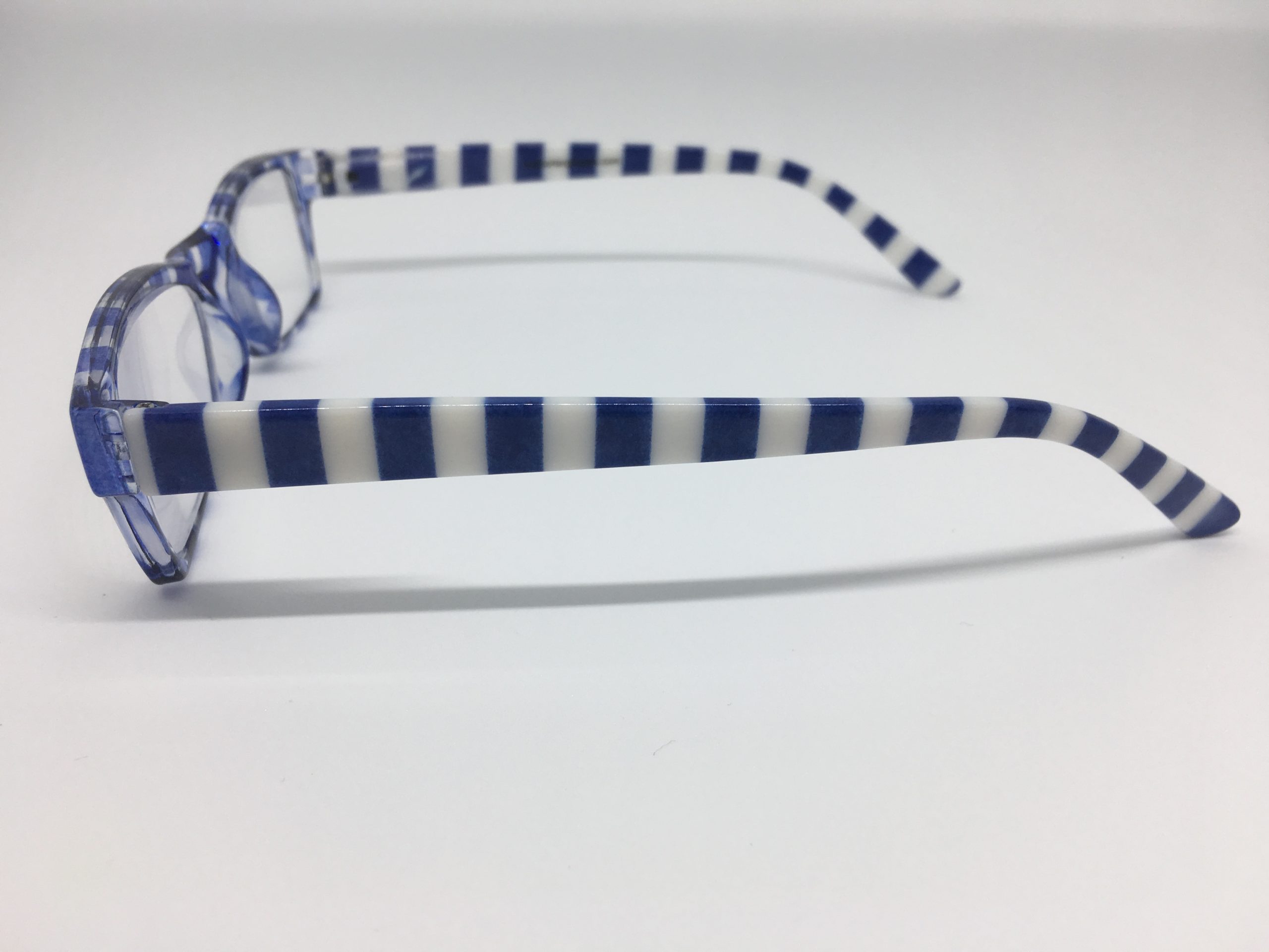 Hochwertige Lesebrille im Blockstreifen-Design in blau-weiß aus Kunststoff, erstklassig verarbeitet. Ausführung unisex. Lieferung inkl. Brillen-Beutel aus Mikrofaser im gleichen Design.