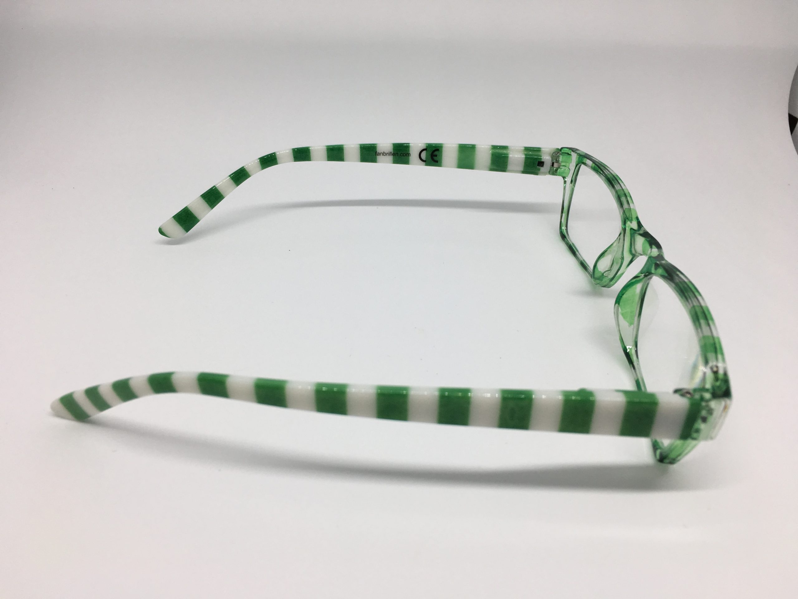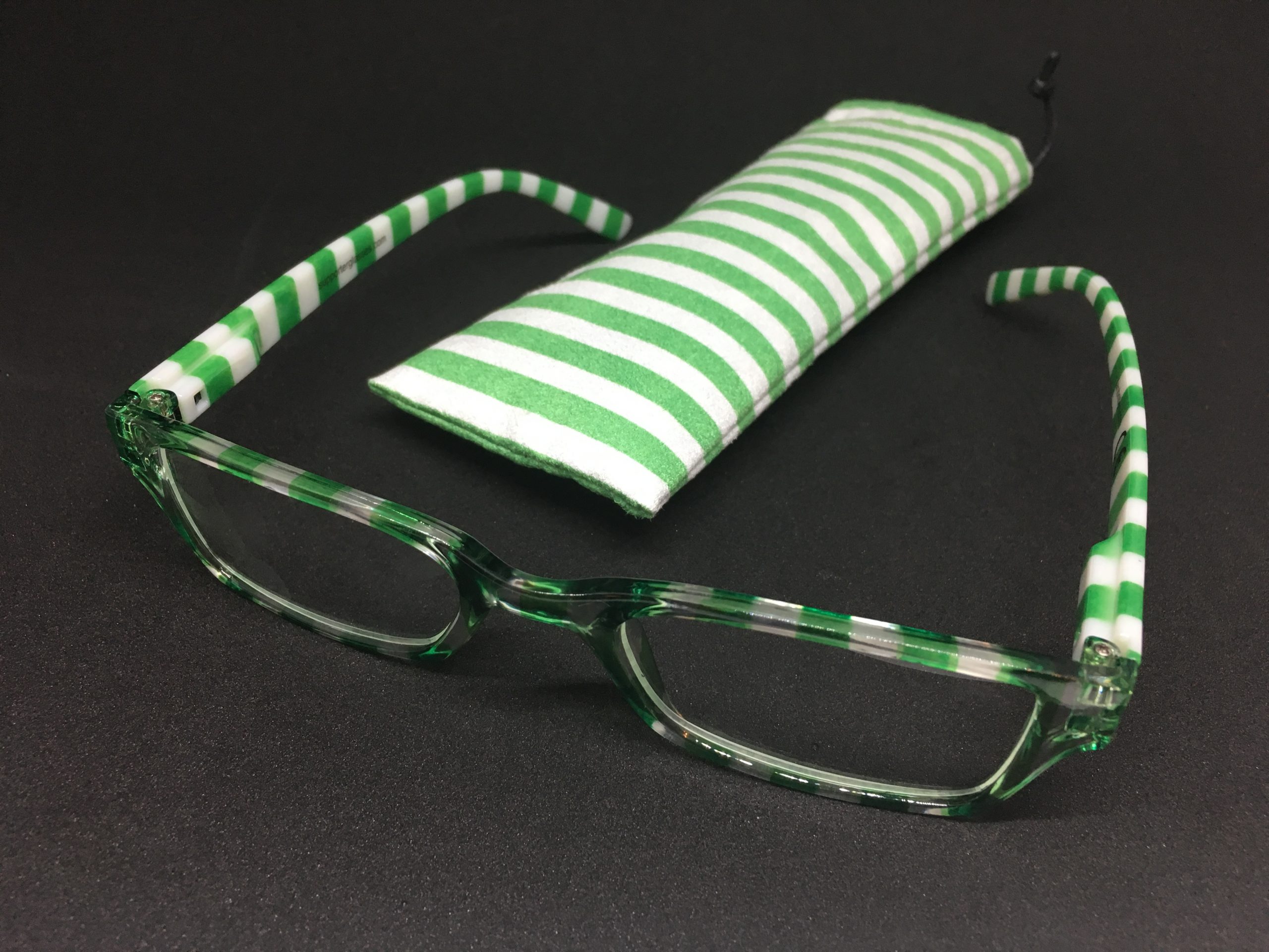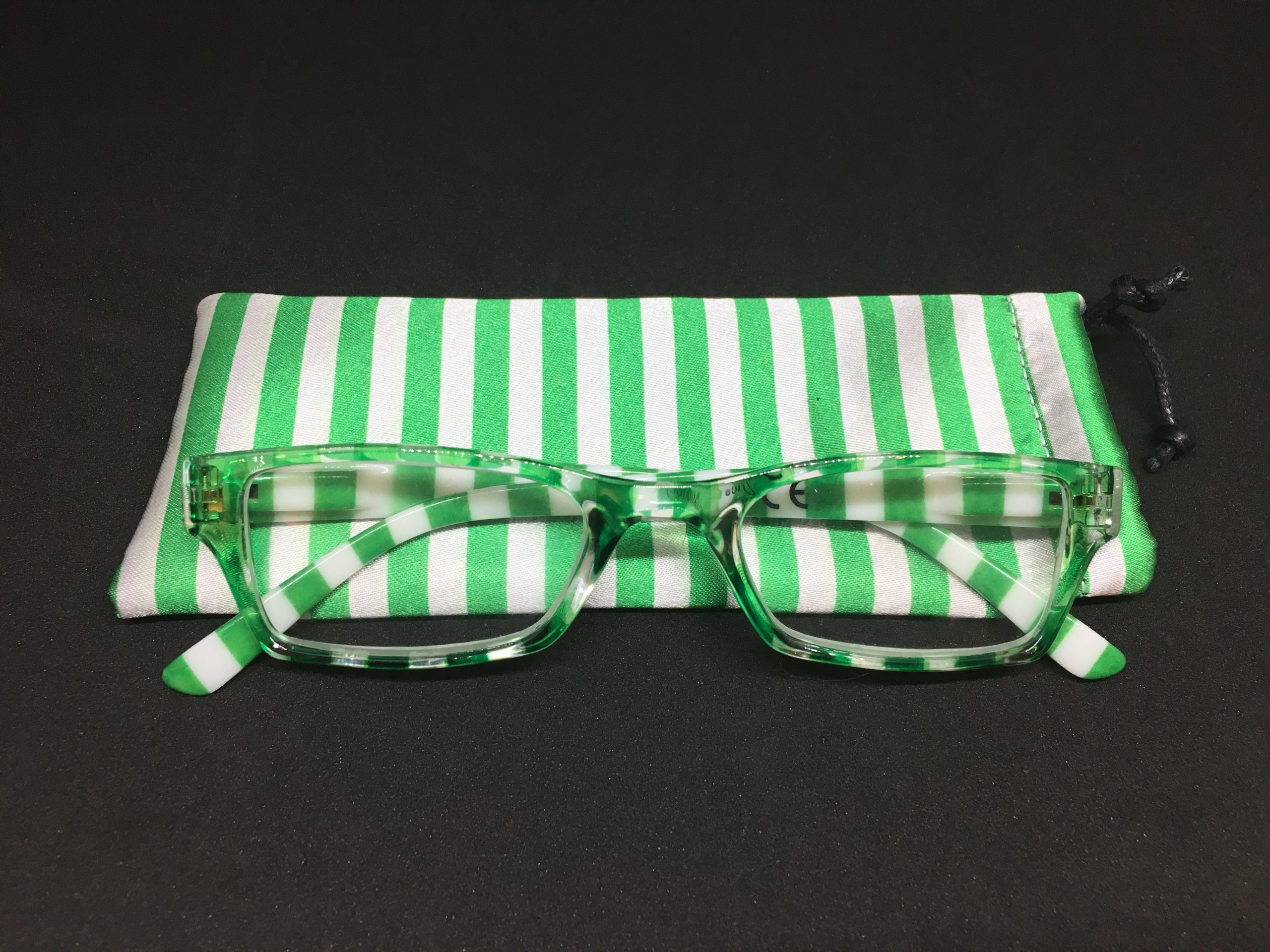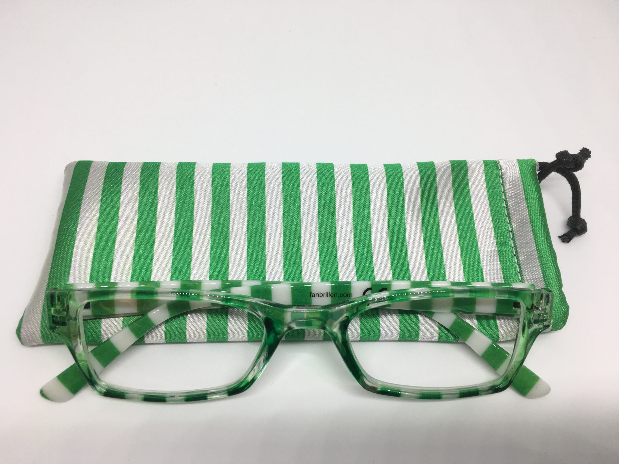 Hochwertige Lesebrille im Blockstreifen-Design in grün-weiß aus Kunststoff, erstklassig verarbeitet. Ausführung unisex. Lieferung inkl. Brillen-Beutel aus Mikrofaser im gleichen Design.