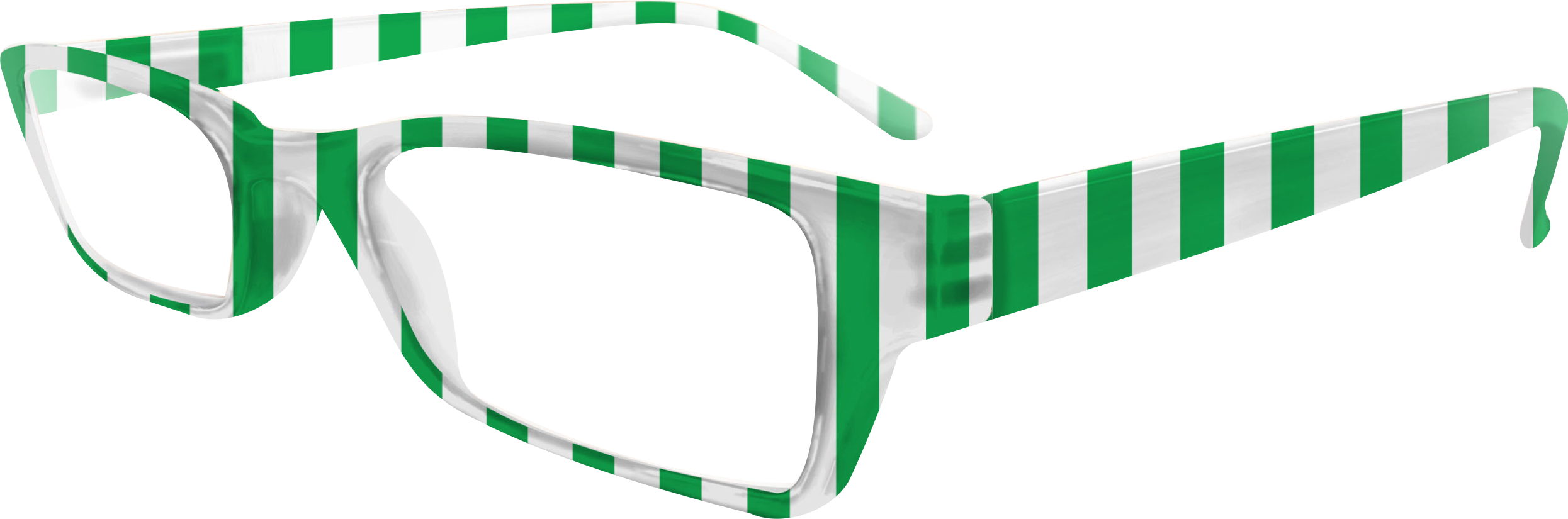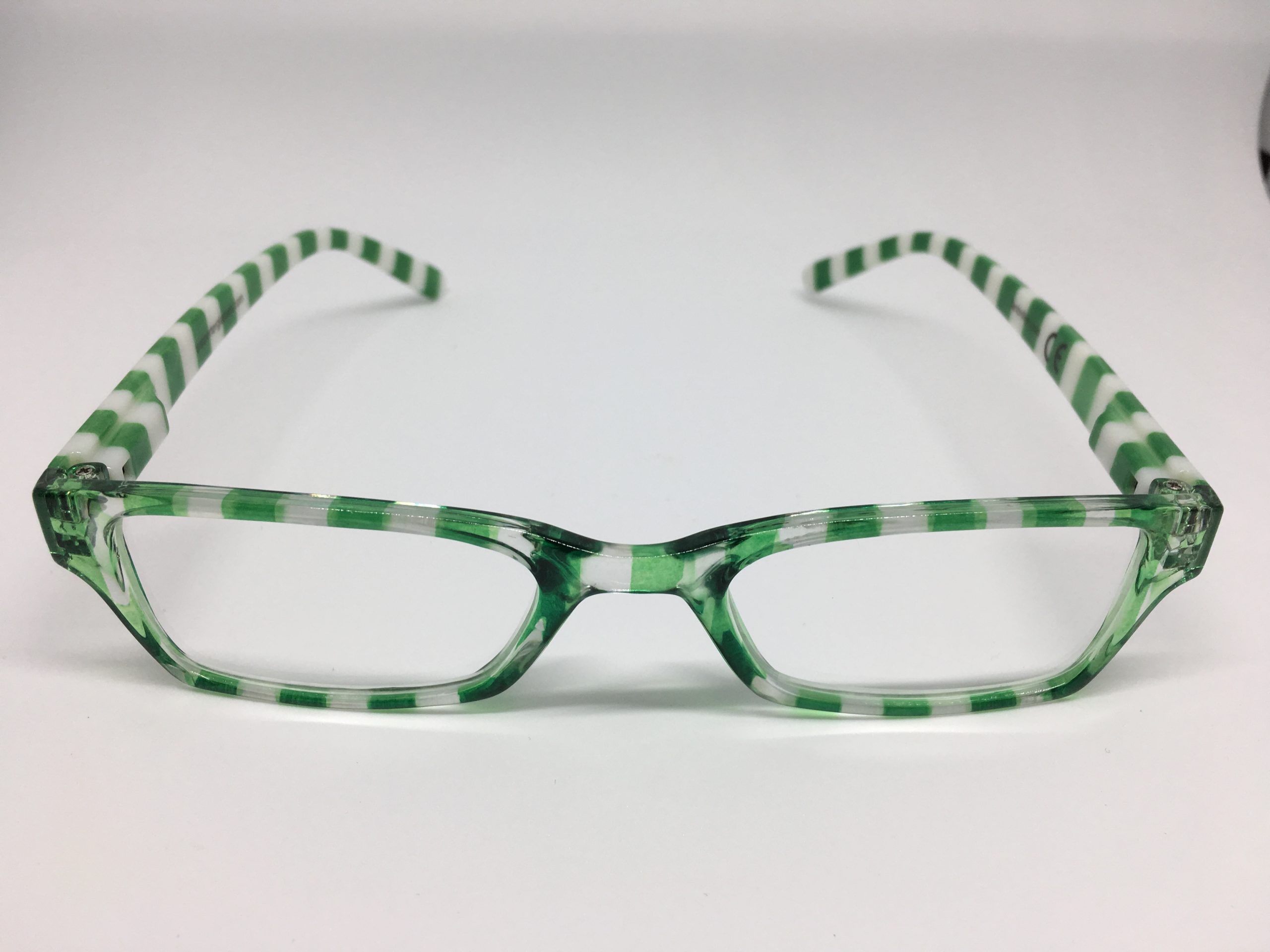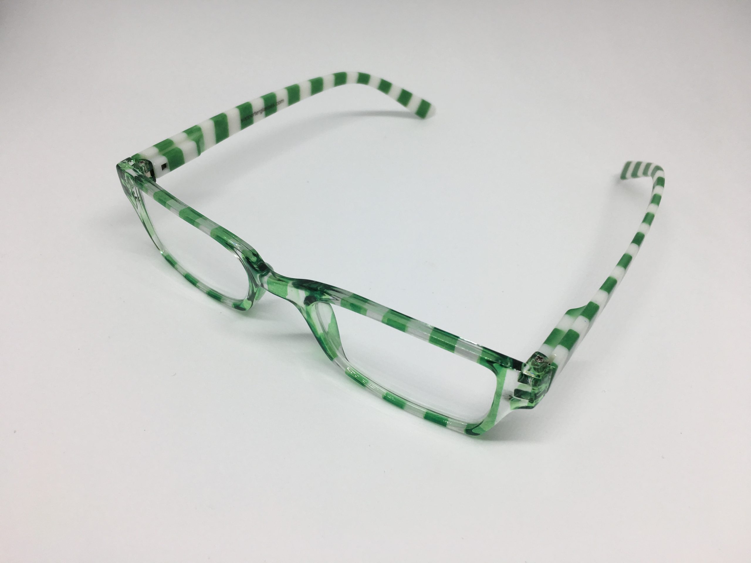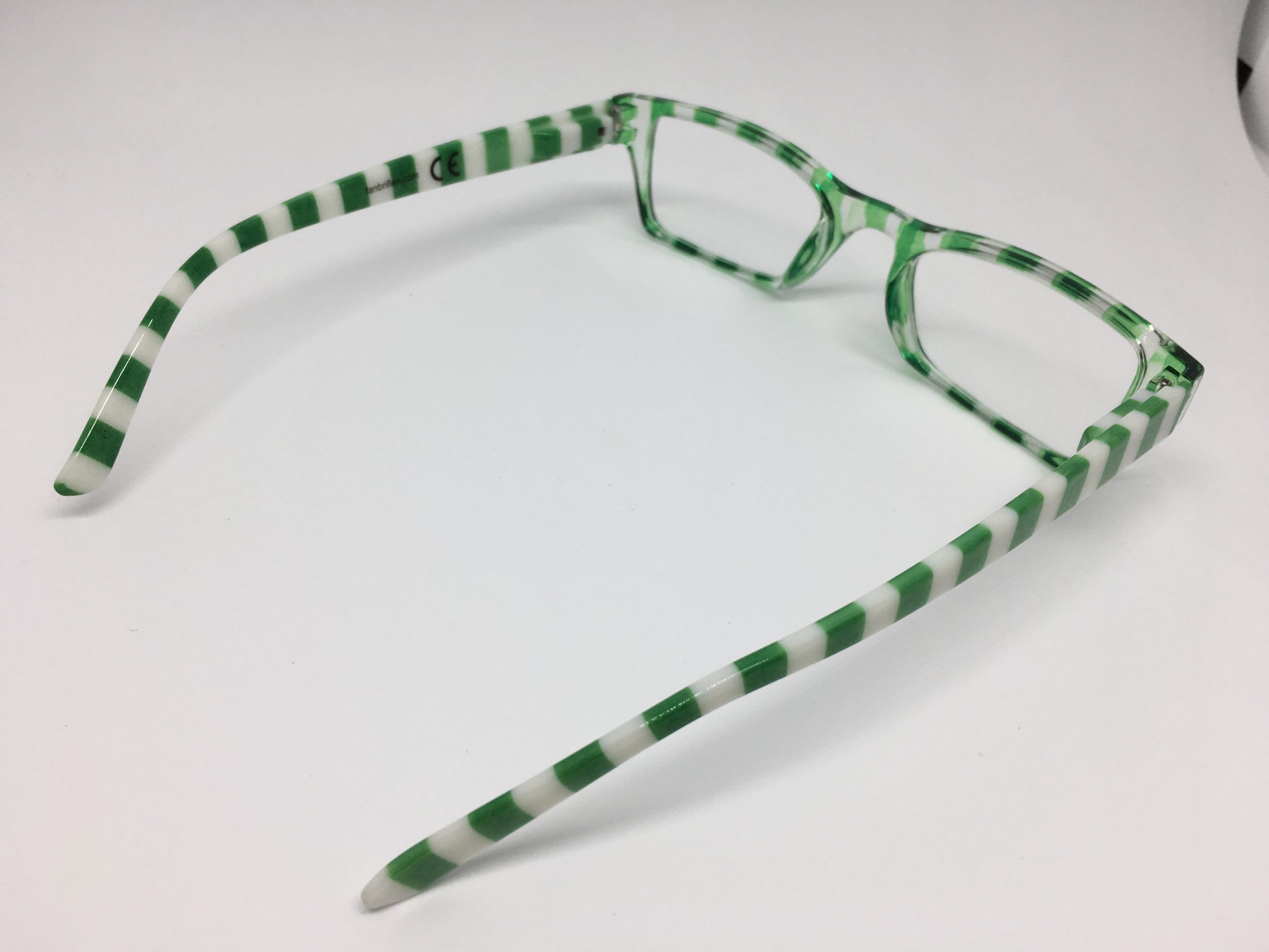 Hochwertige Lesebrille im Blockstreifen-Design in grün-weiß aus Kunststoff, erstklassig verarbeitet. Ausführung unisex. Lieferung inkl. Brillen-Beutel aus Mikrofaser im gleichen Design.