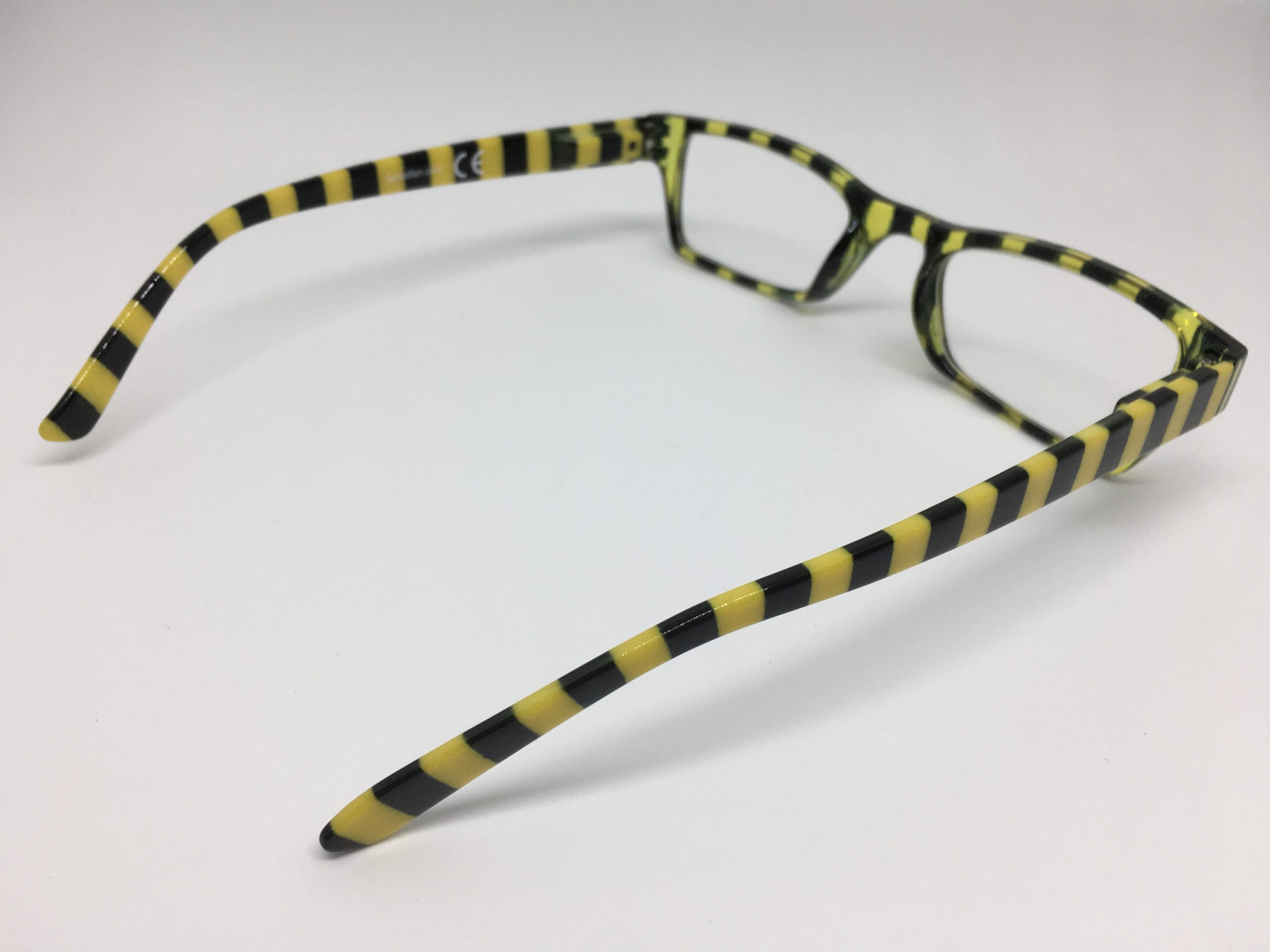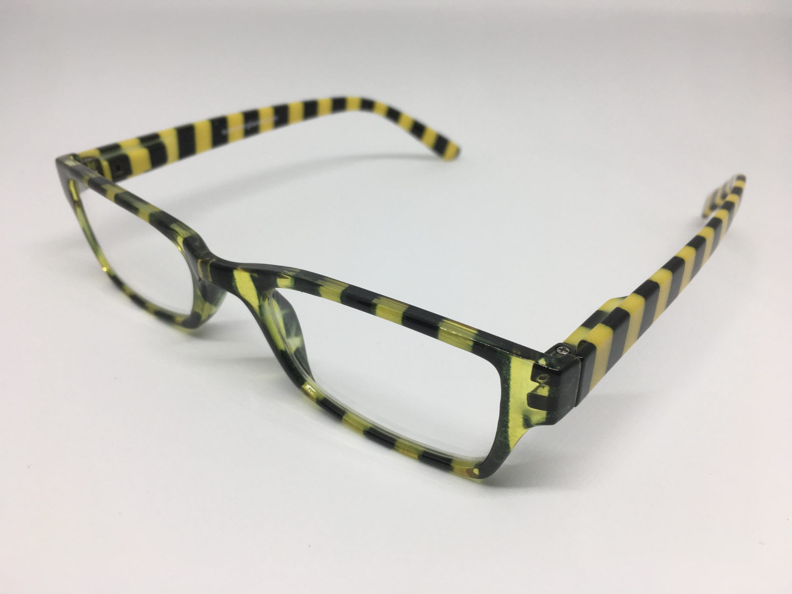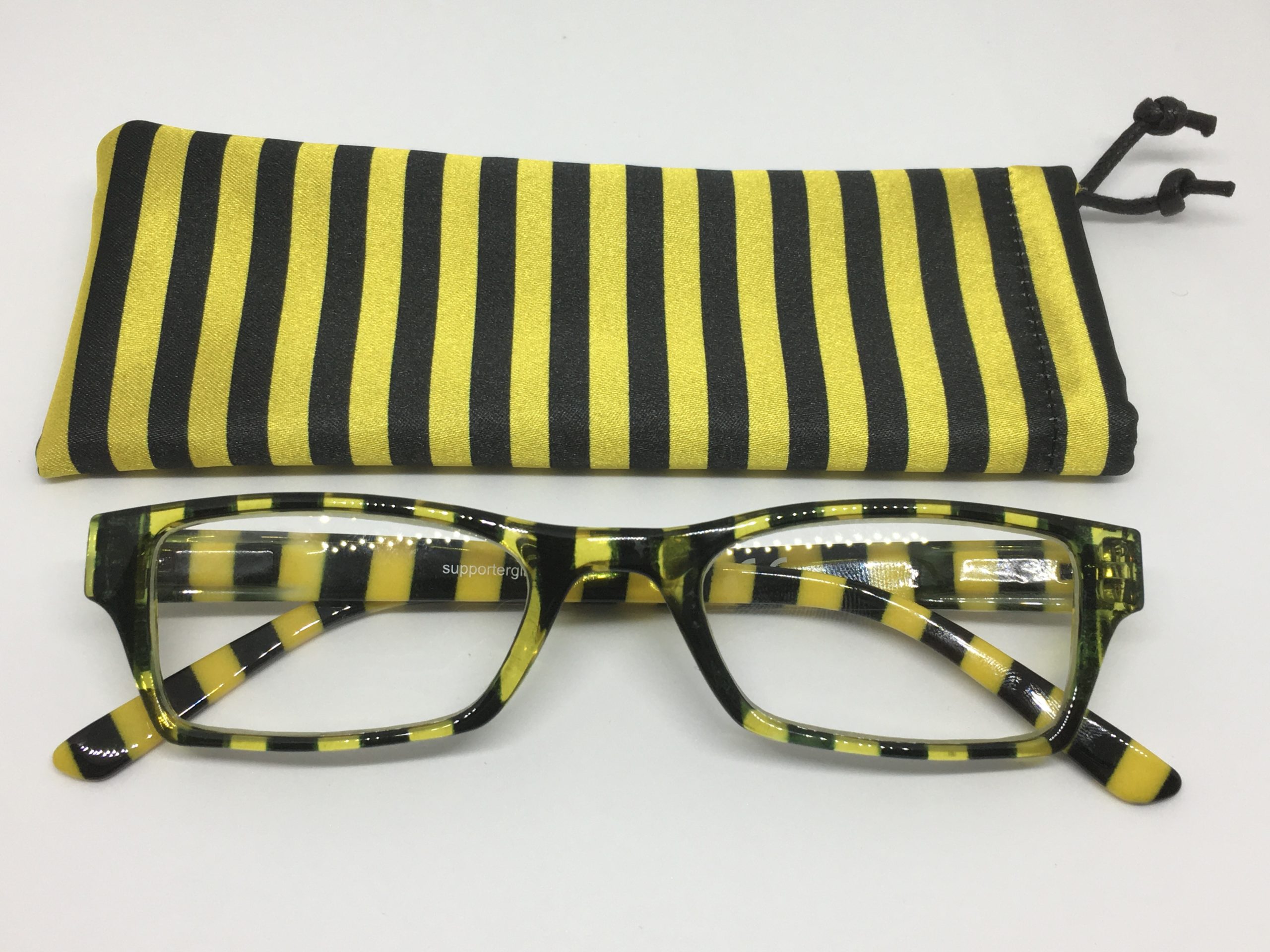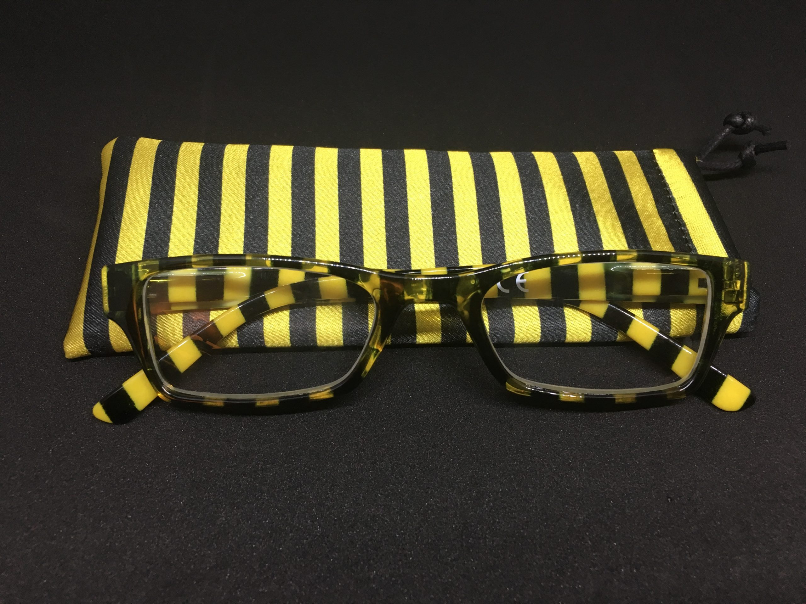 Hochwertige Lesebrille im Blockstreifen-Design in schwarz-gelb aus Kunststoff, erstklassig verarbeitet. Ausführung unisex. Lieferung inkl. Brillen-Beutel aus Mikrofaser im gleichen Design.