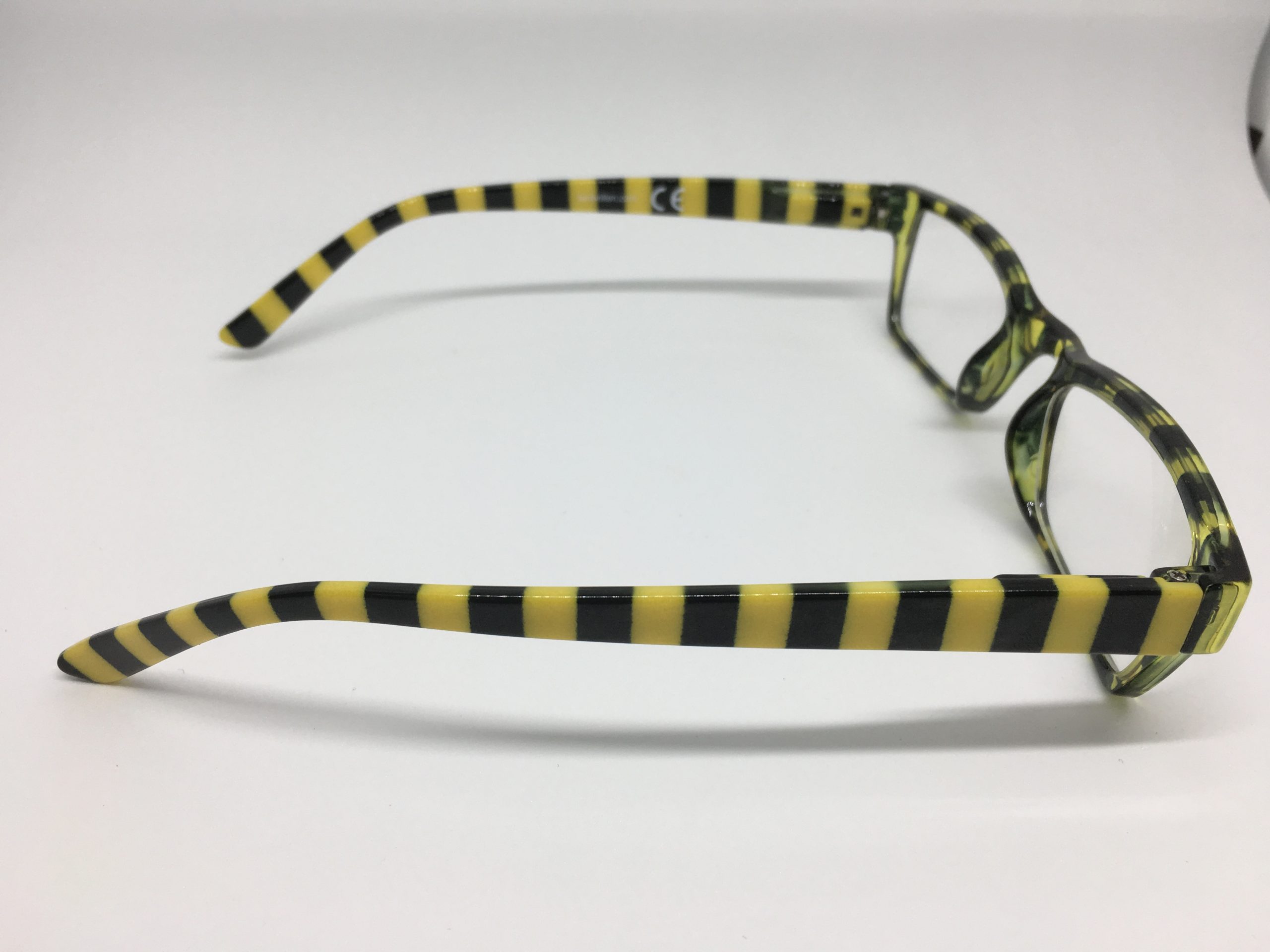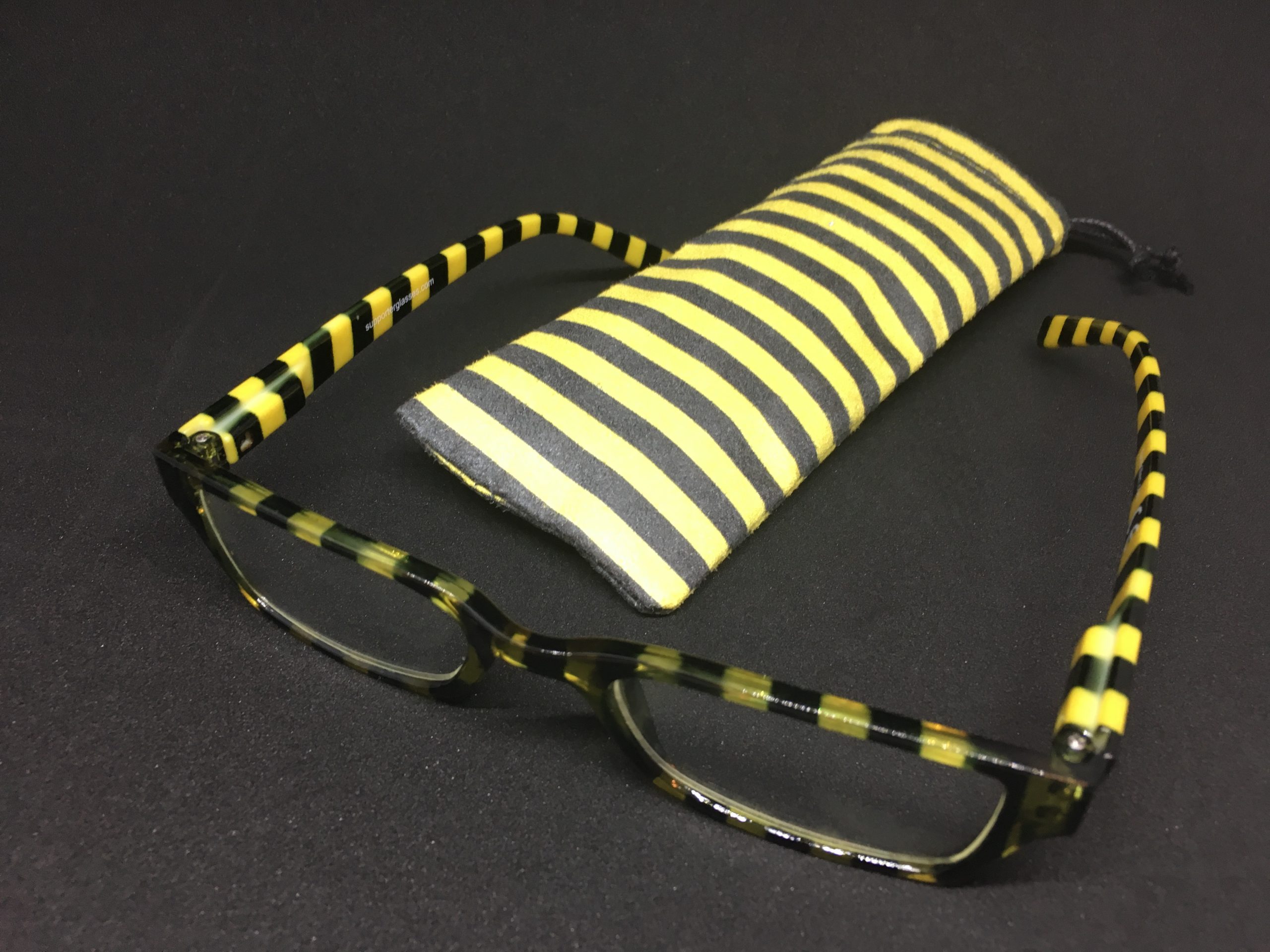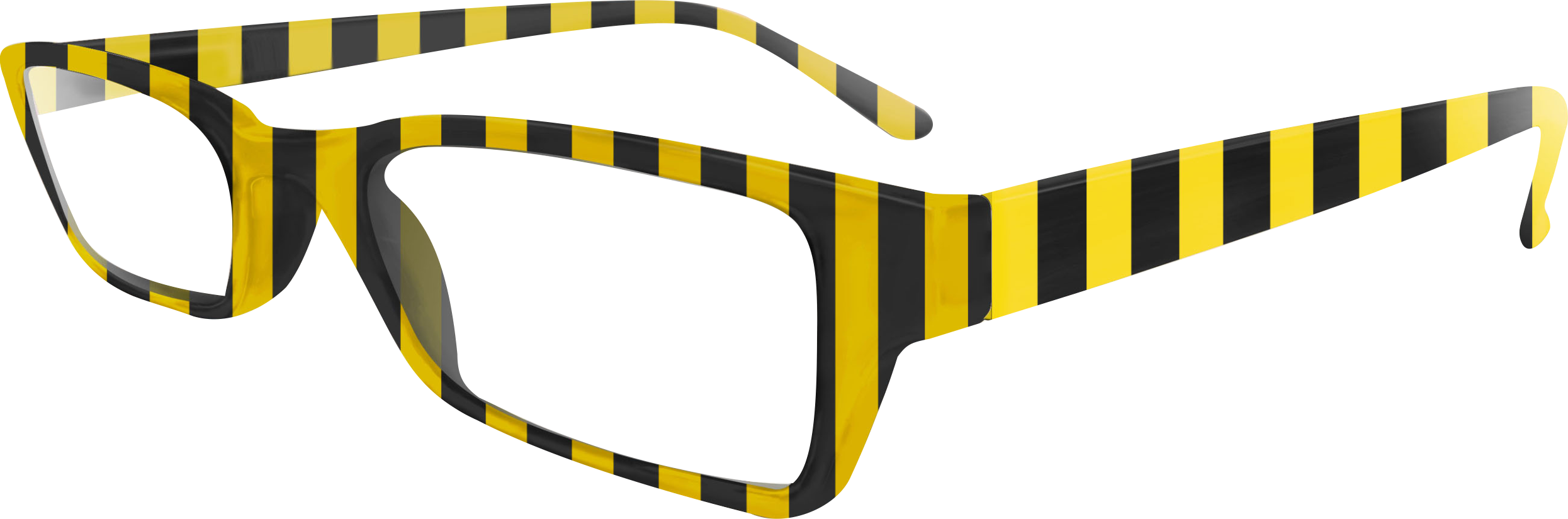 Hochwertige Lesebrille im Blockstreifen-Design in schwarz-gelb aus Kunststoff, erstklassig verarbeitet. Ausführung unisex. Lieferung inkl. Brillen-Beutel aus Mikrofaser im gleichen Design.