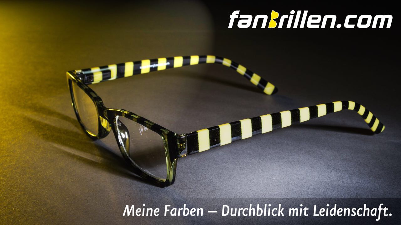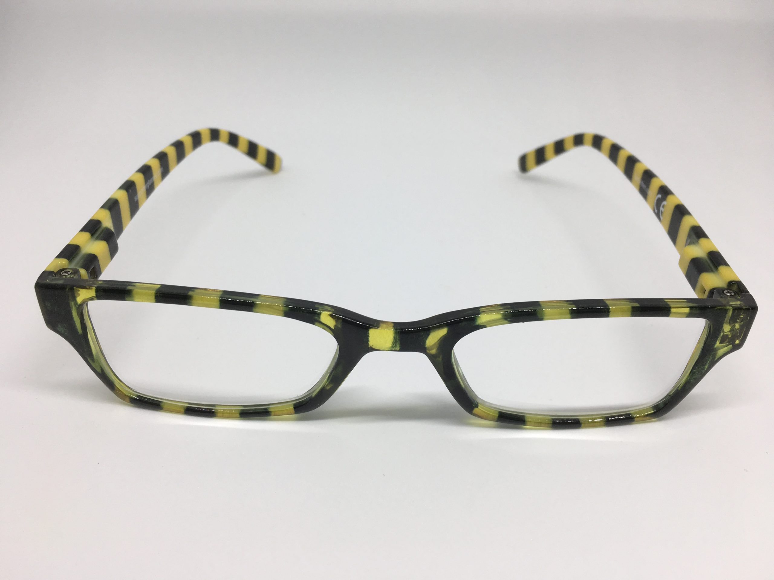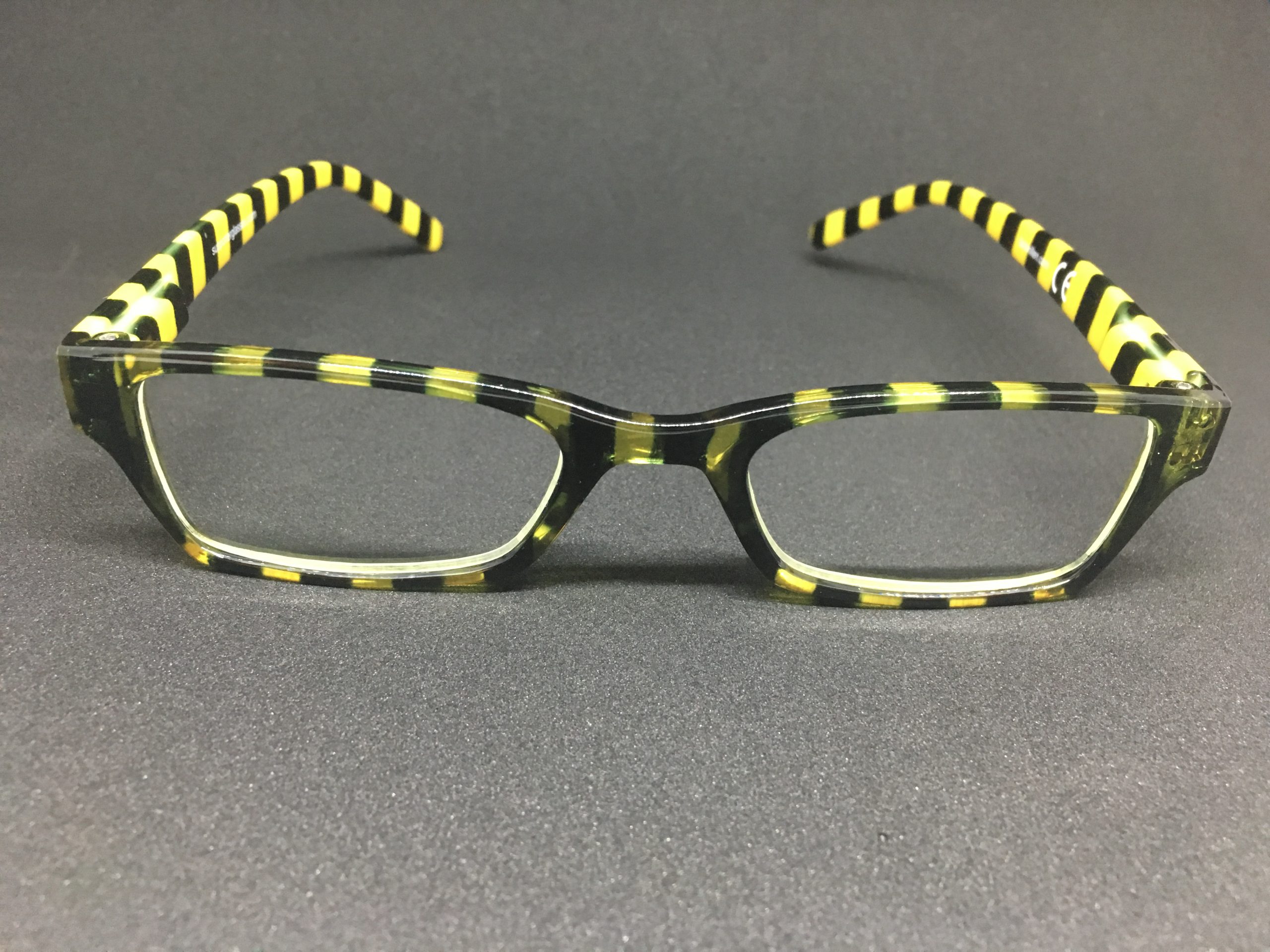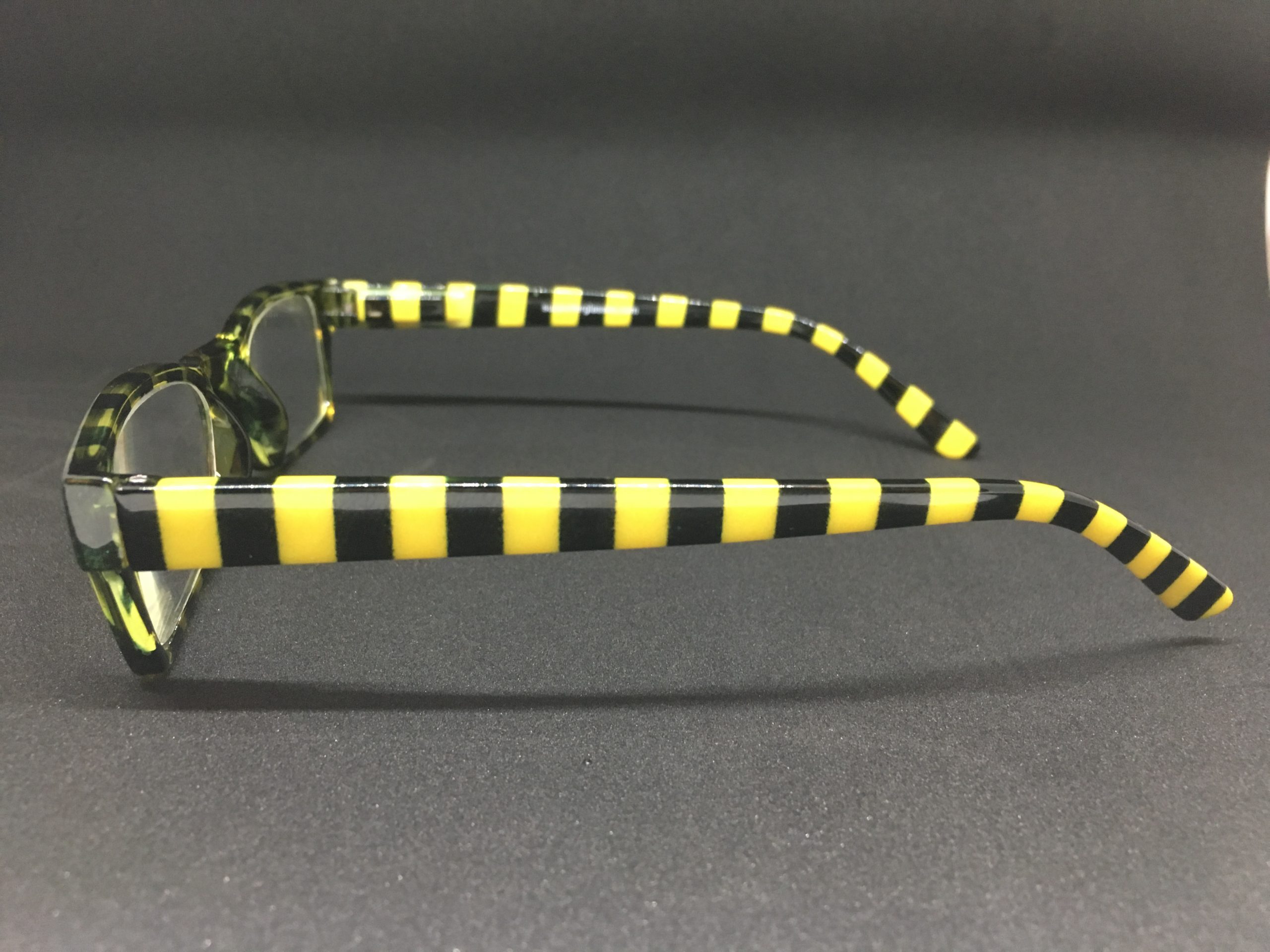 Hochwertige Lesebrille im Blockstreifen-Design in schwarz-gelb aus Kunststoff, erstklassig verarbeitet. Ausführung unisex. Lieferung inkl. Brillen-Beutel aus Mikrofaser im gleichen Design.