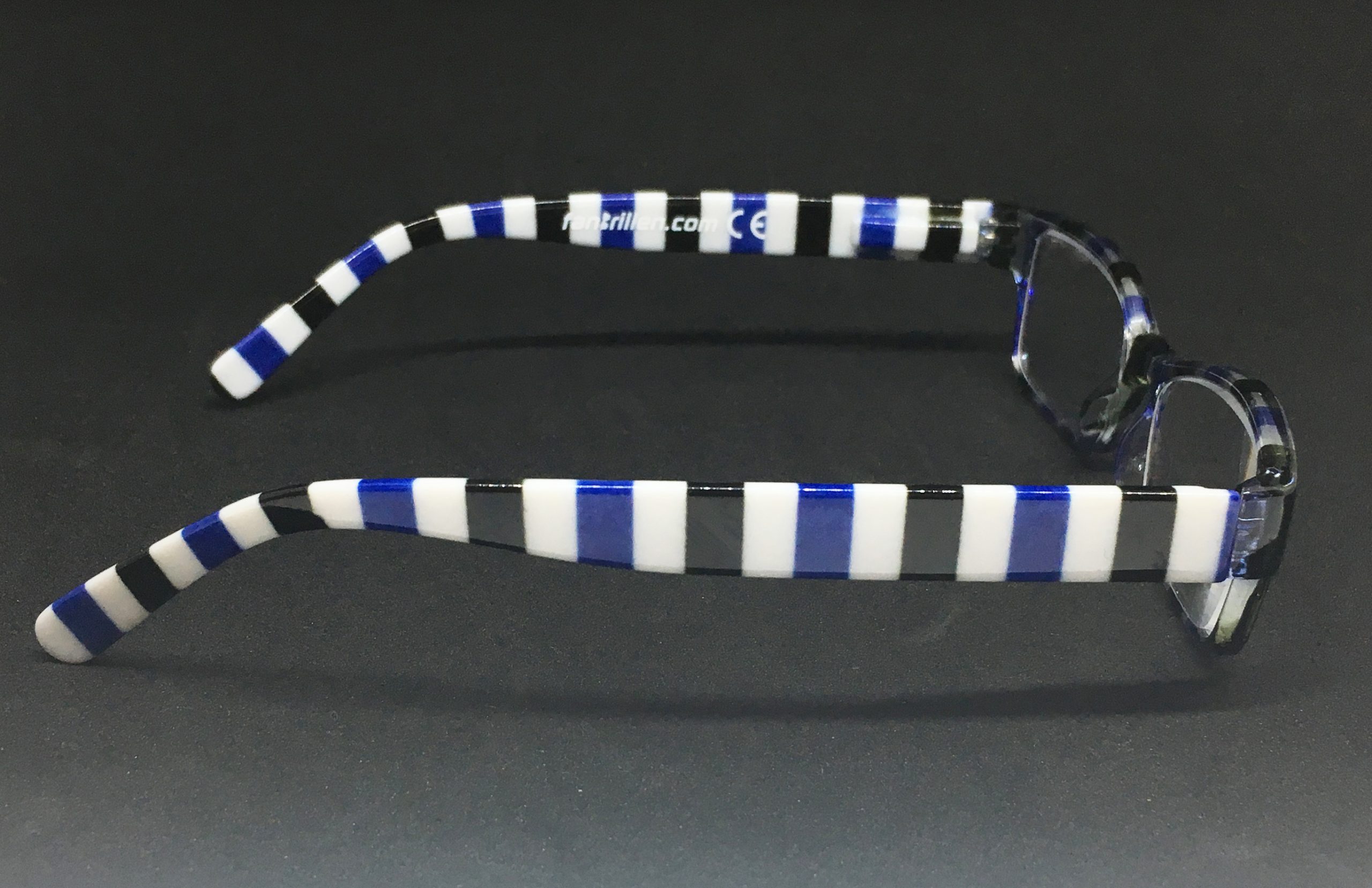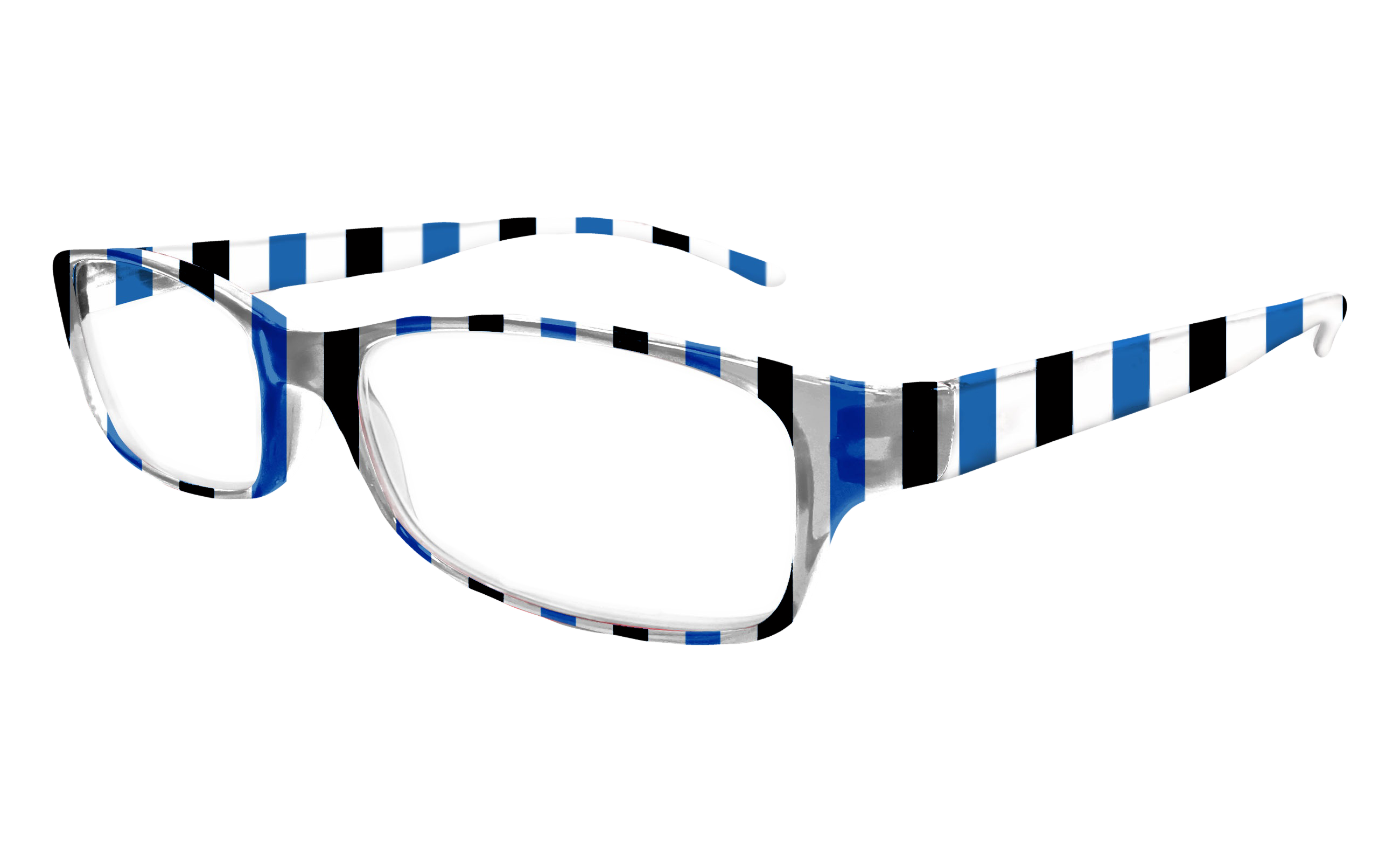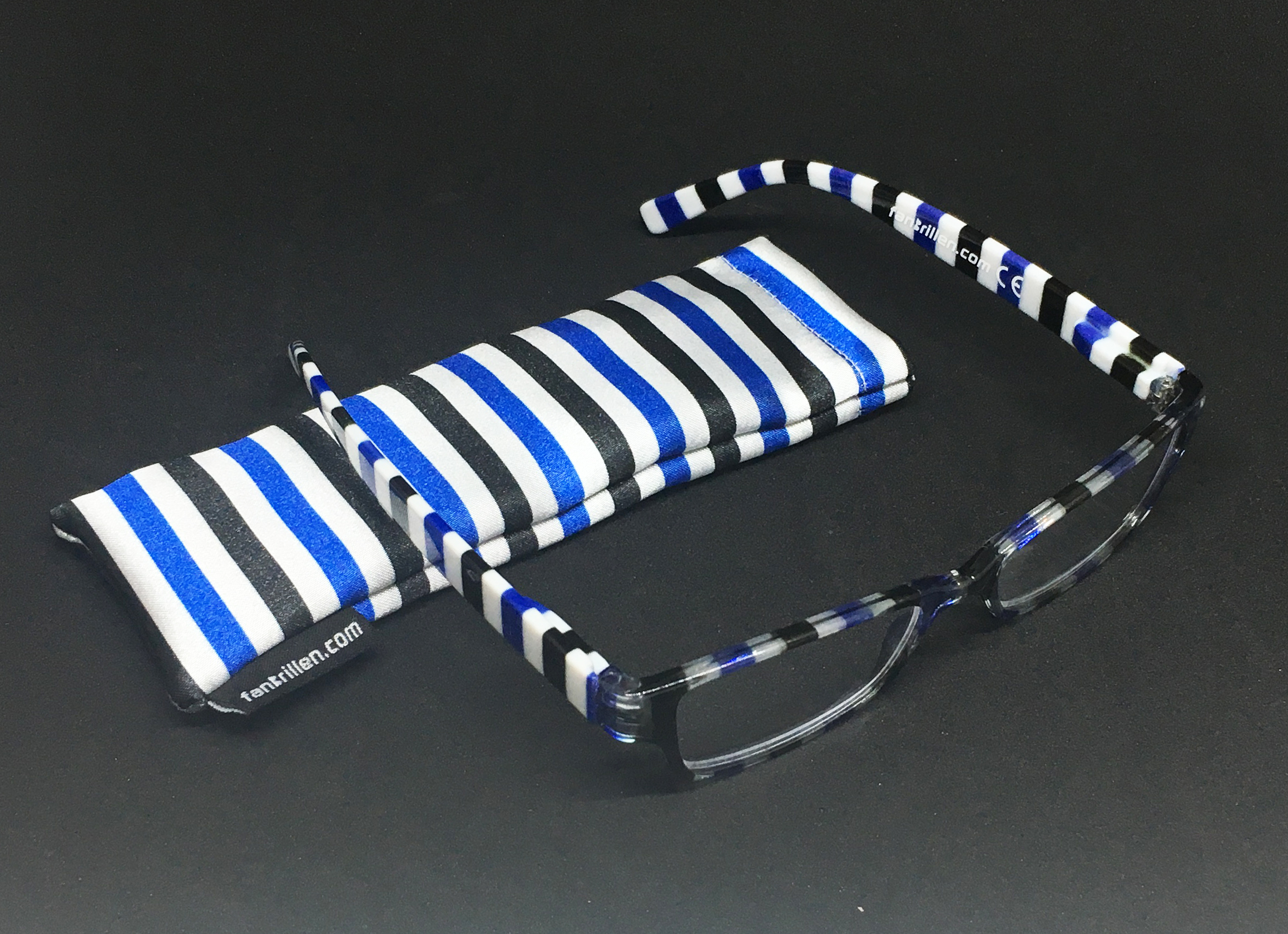 Hochwertige Lesebrille im Blockstreifen-Design in schwarz-weiß-blau aus Kunststoff, erstklassig verarbeitet. Ausführung unisex. Lieferung inkl. Brillen-Beutel aus Mikrofaser im gleichen Design.
