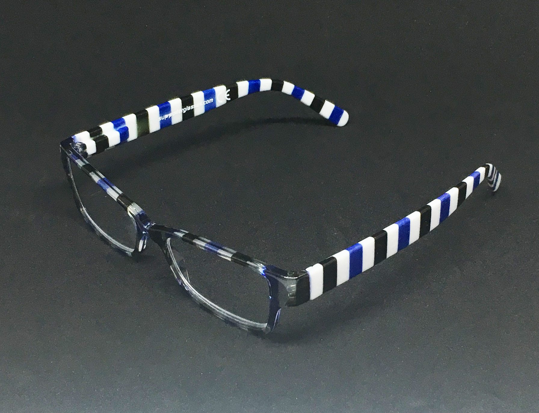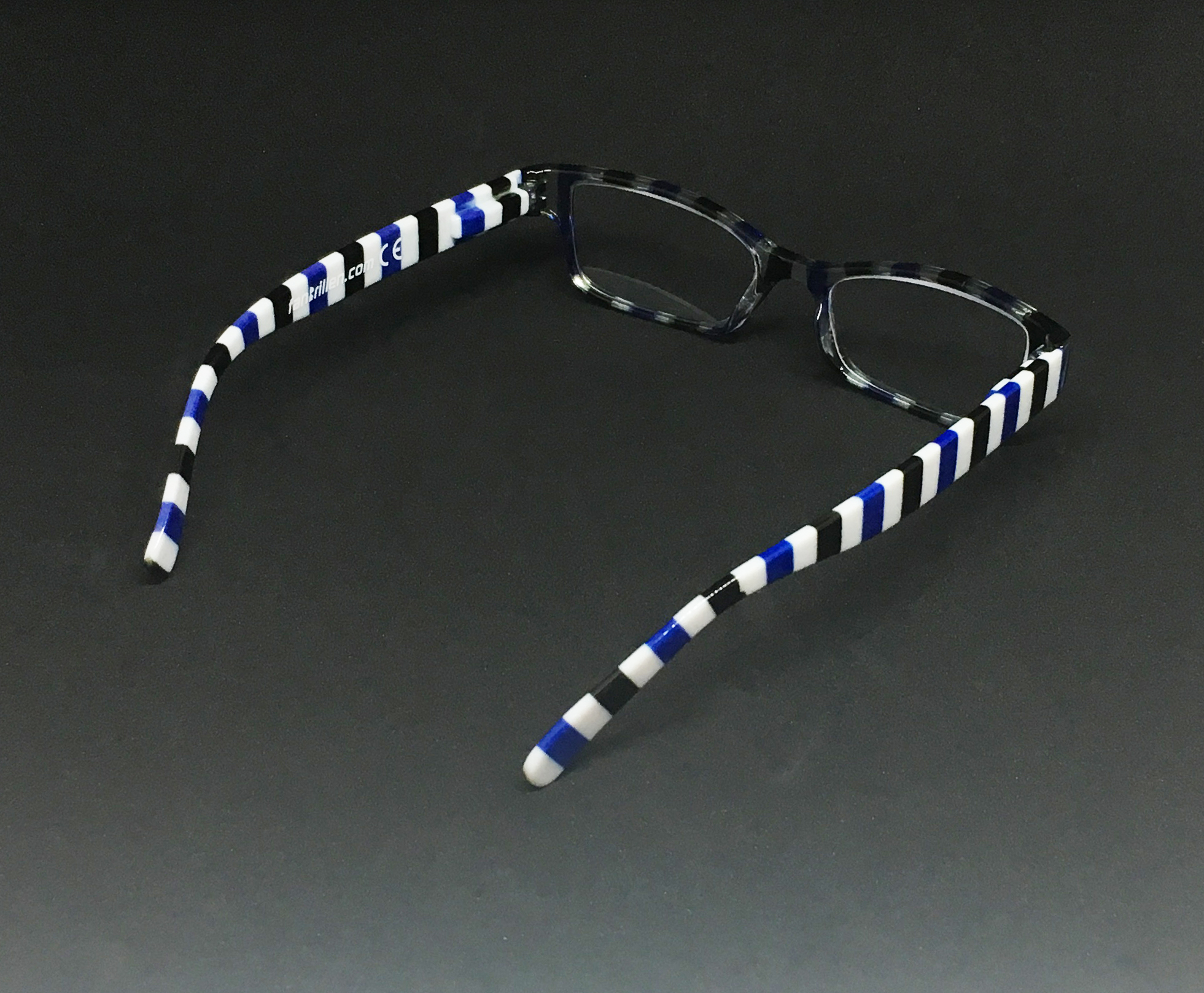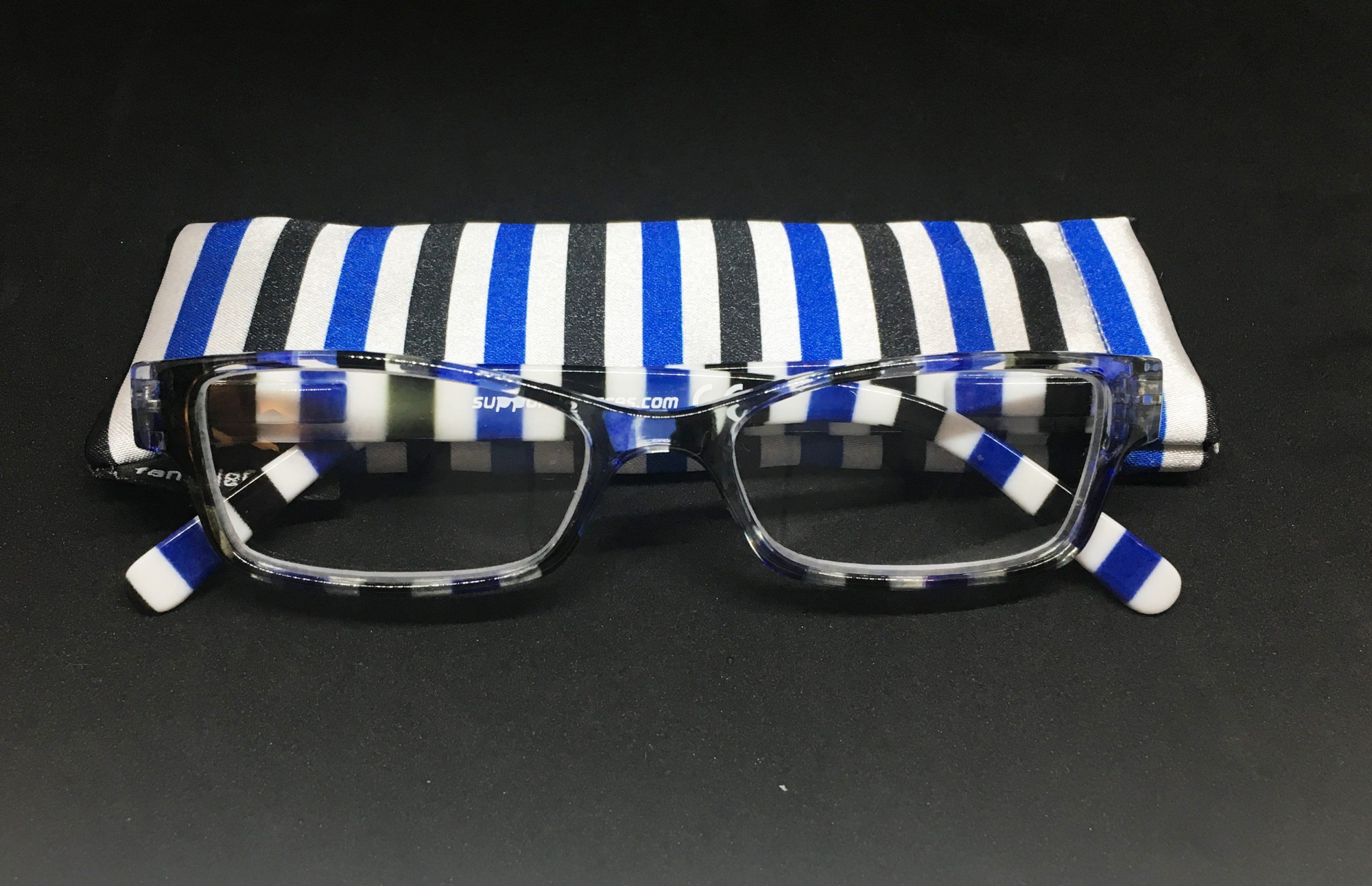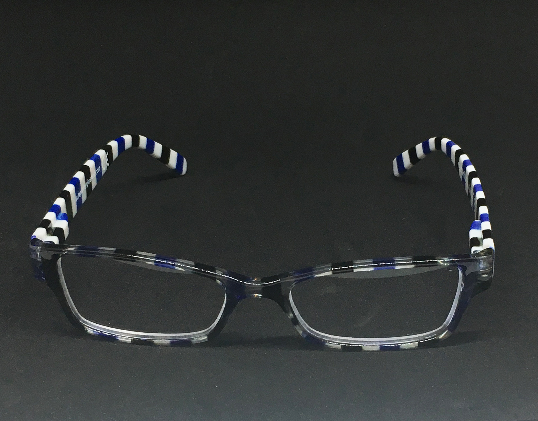 Hochwertige Lesebrille im Blockstreifen-Design in schwarz-weiß-blau aus Kunststoff, erstklassig verarbeitet. Ausführung unisex. Lieferung inkl. Brillen-Beutel aus Mikrofaser im gleichen Design.