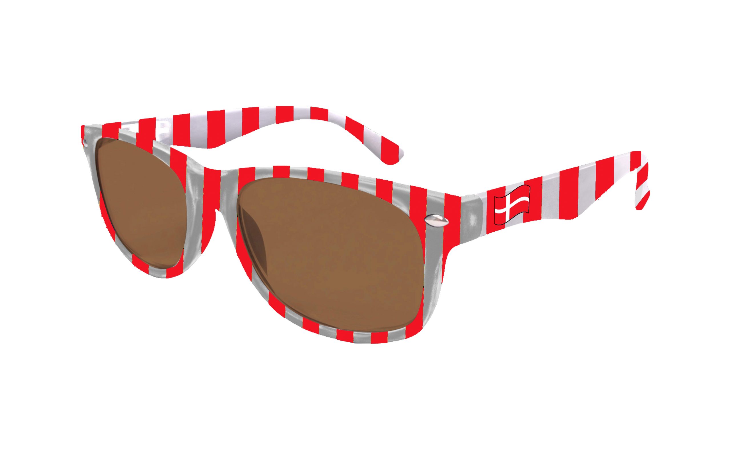 Hochwertige Sonnenbrille im Blockstreifen-Design in rot-weiß aus Kunststoff, erstklassig verarbeitet. Ausführung unisex. Lieferung inkl. Brillen-Beutel aus Mikrofaser im gleichen Design.