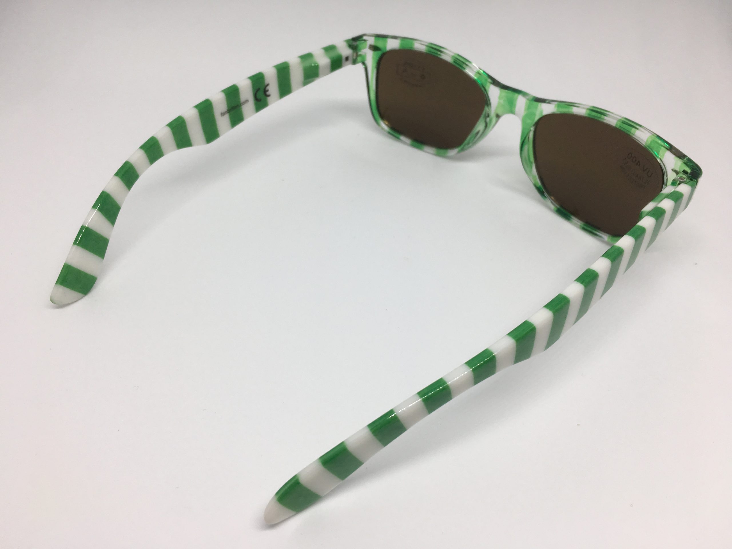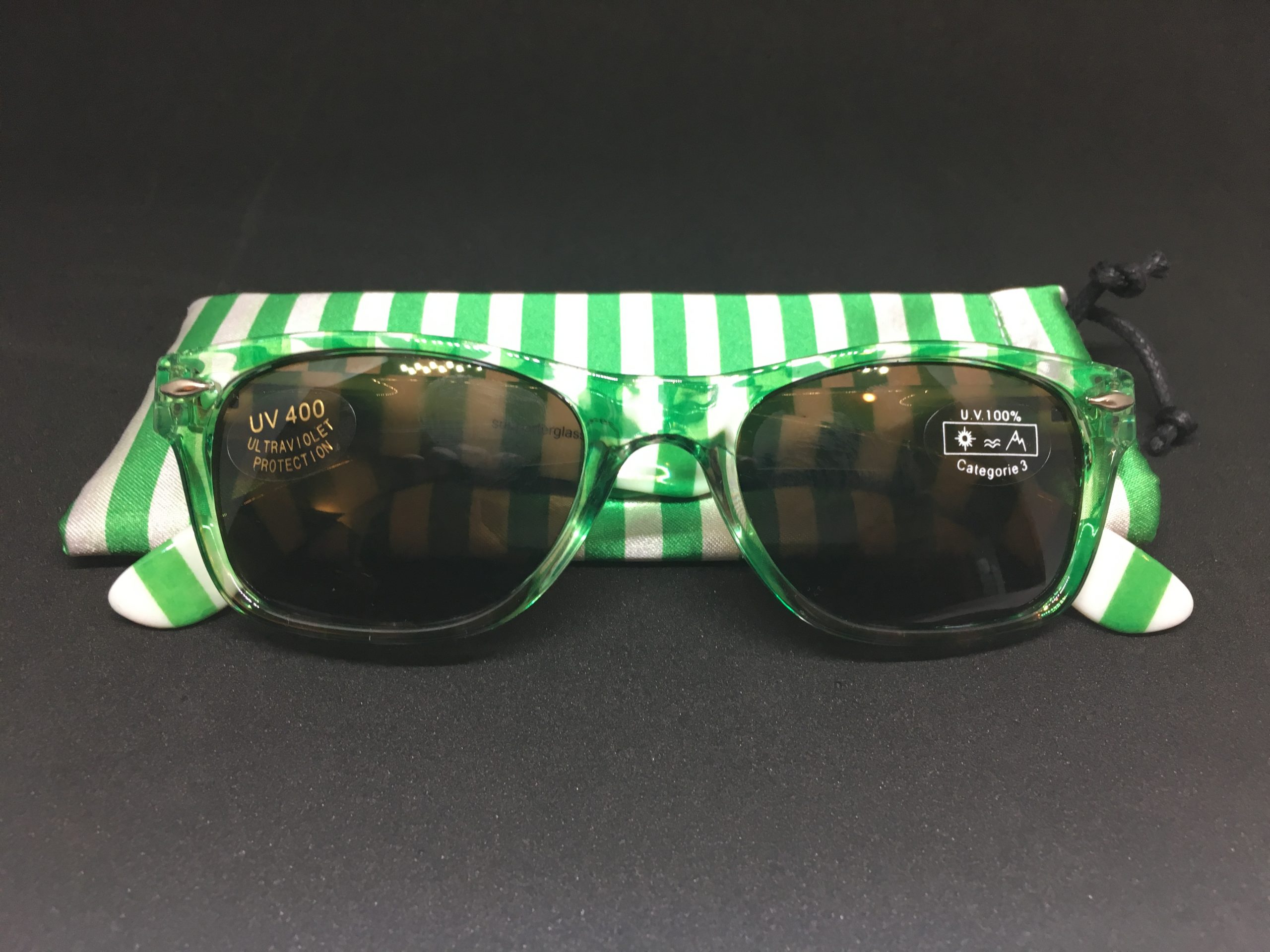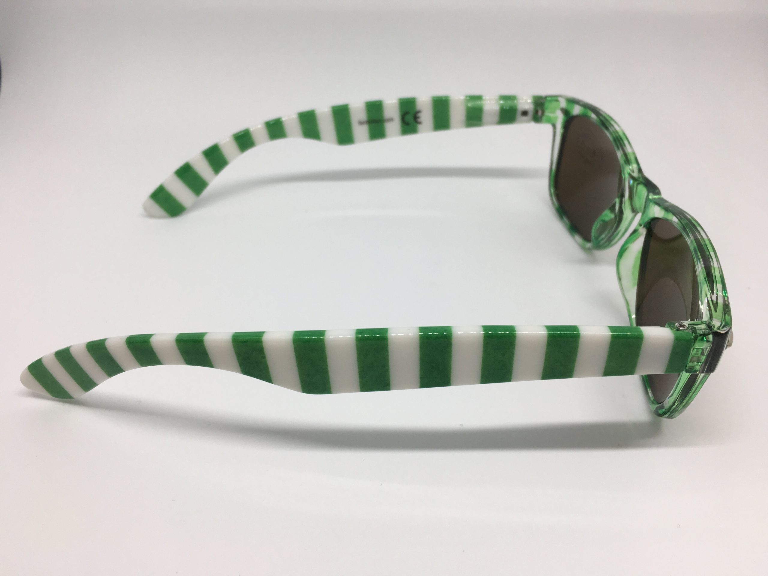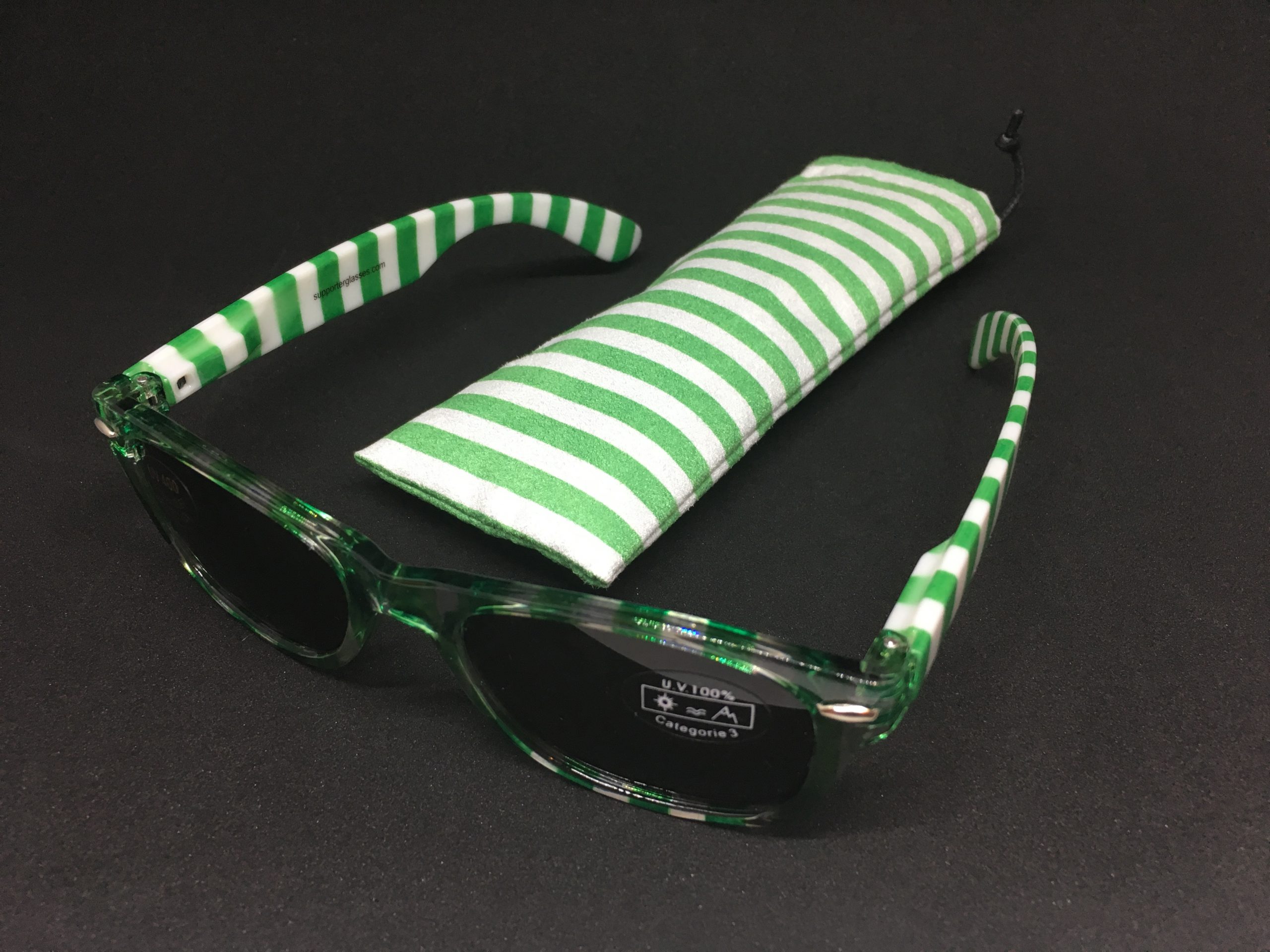 Hochwertige Sonnenbrille im Blockstreifen-Design in grün-weiß aus Kunststoff, erstklassig verarbeitet. Ausführung unisex. Lieferung inkl. Brillen-Beutel aus Mikrofaser im gleichen Design.
