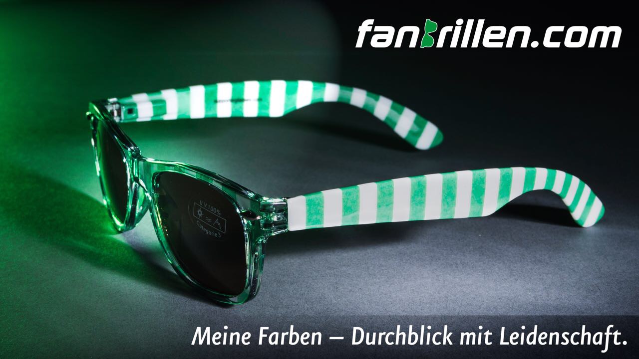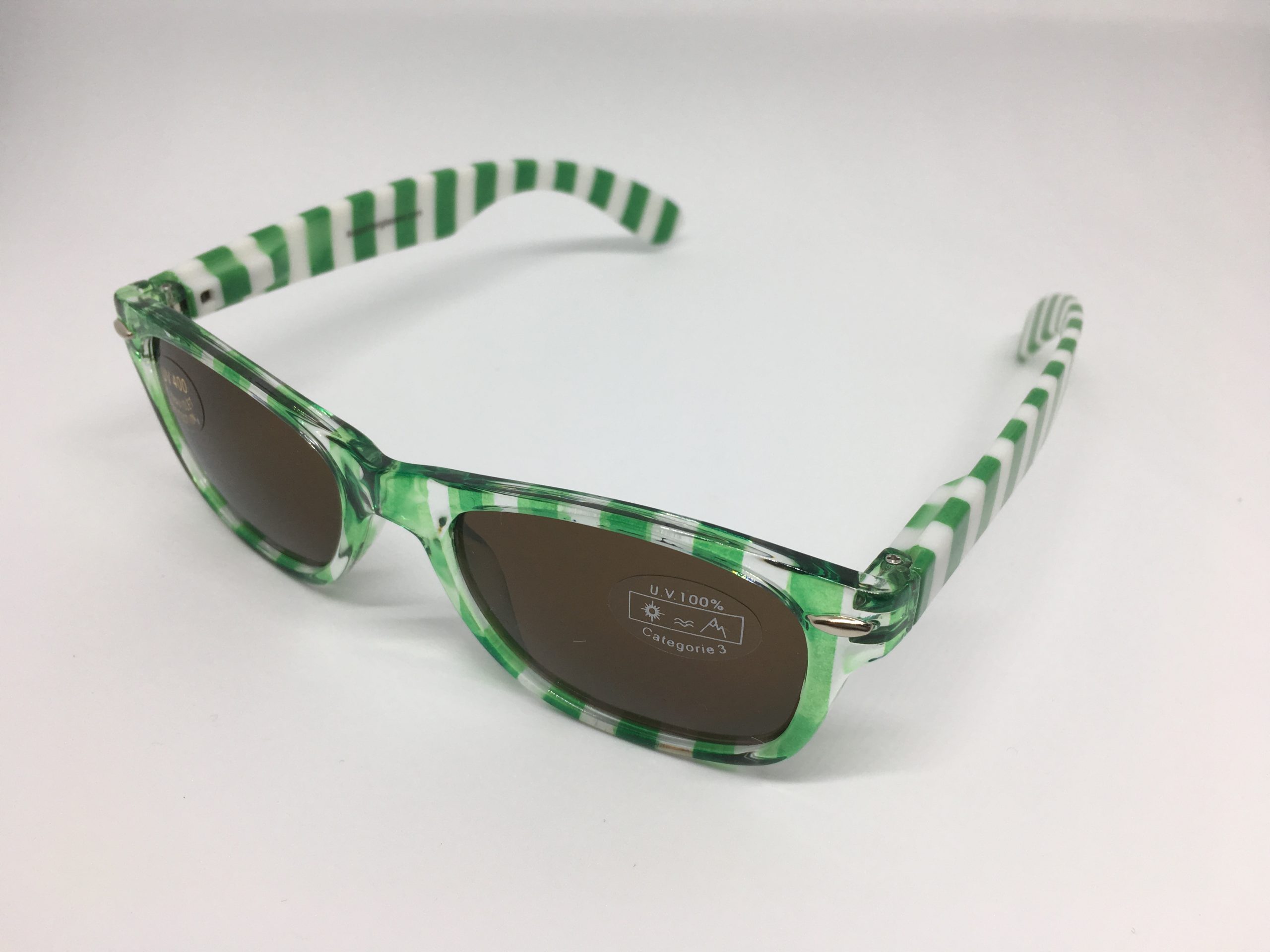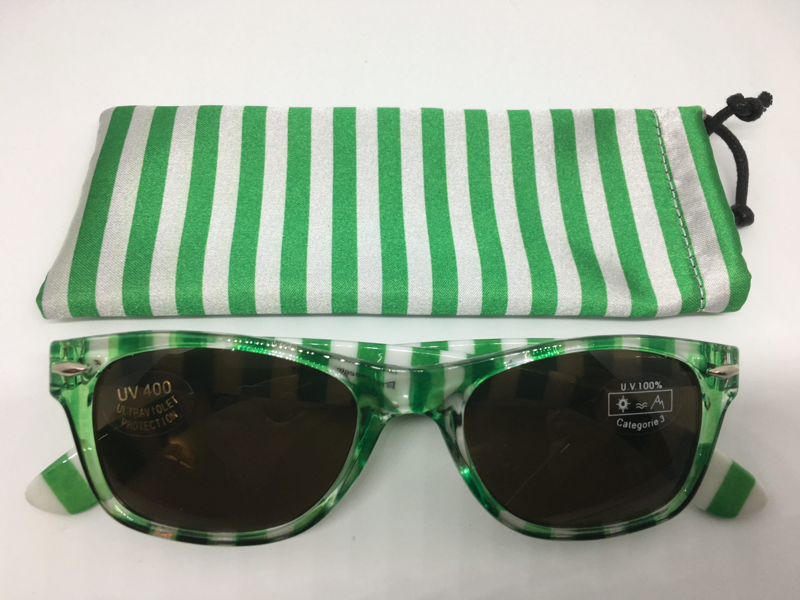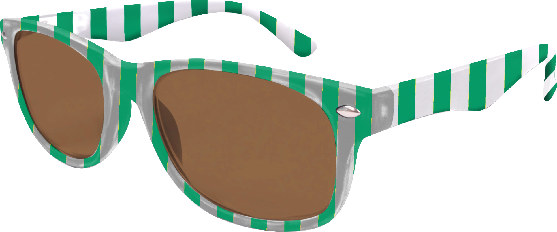 Hochwertige Sonnenbrille im Blockstreifen-Design in grün-weiß aus Kunststoff, erstklassig verarbeitet. Ausführung unisex. Lieferung inkl. Brillen-Beutel aus Mikrofaser im gleichen Design.