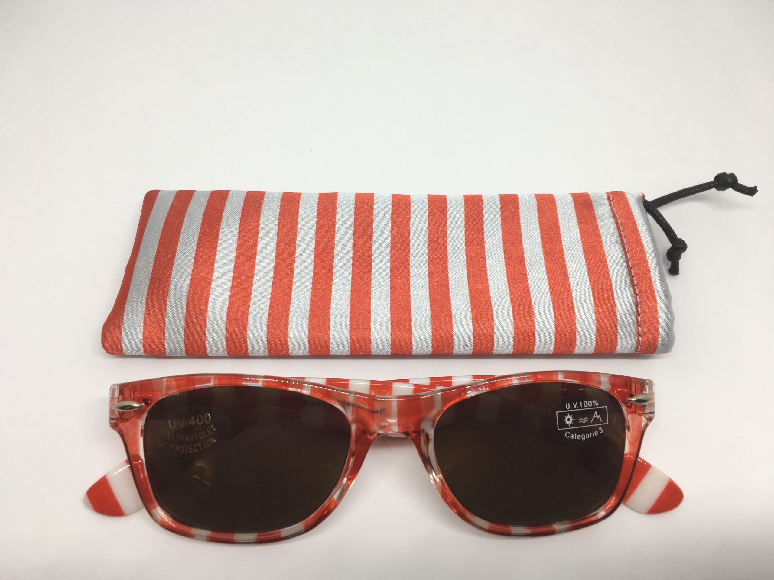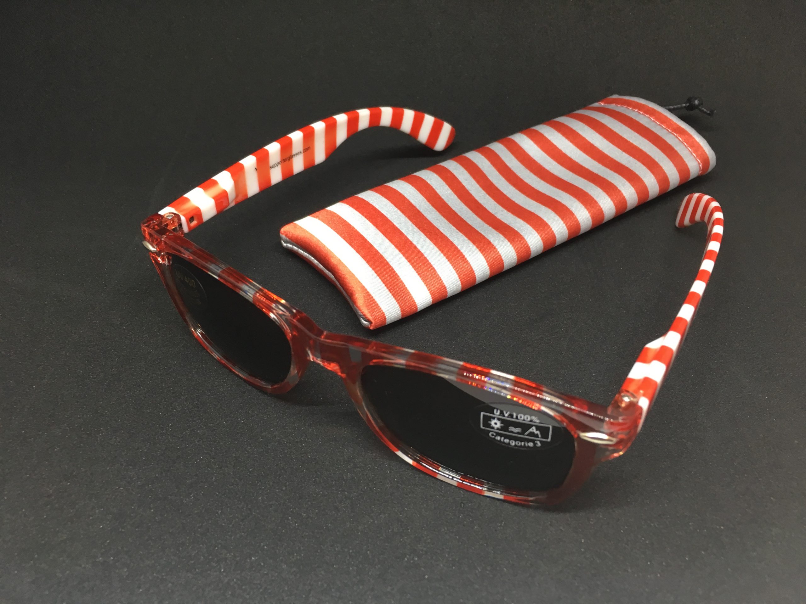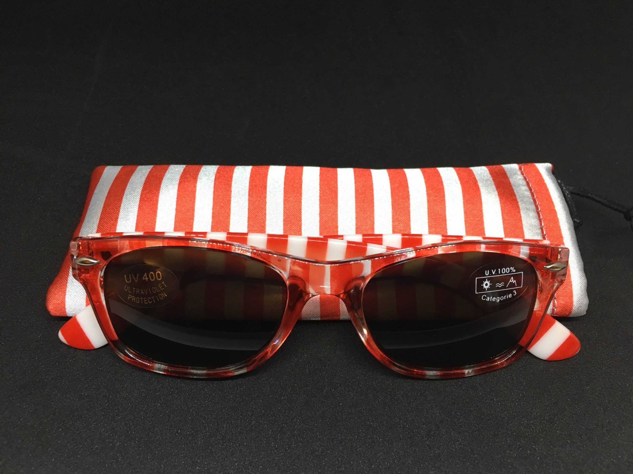 Hochwertige Sonnenbrille im Blockstreifen-Design in rot-weiß aus Kunststoff, erstklassig verarbeitet. Ausführung unisex. Lieferung inkl. Brillen-Beutel aus Mikrofaser im gleichen Design.