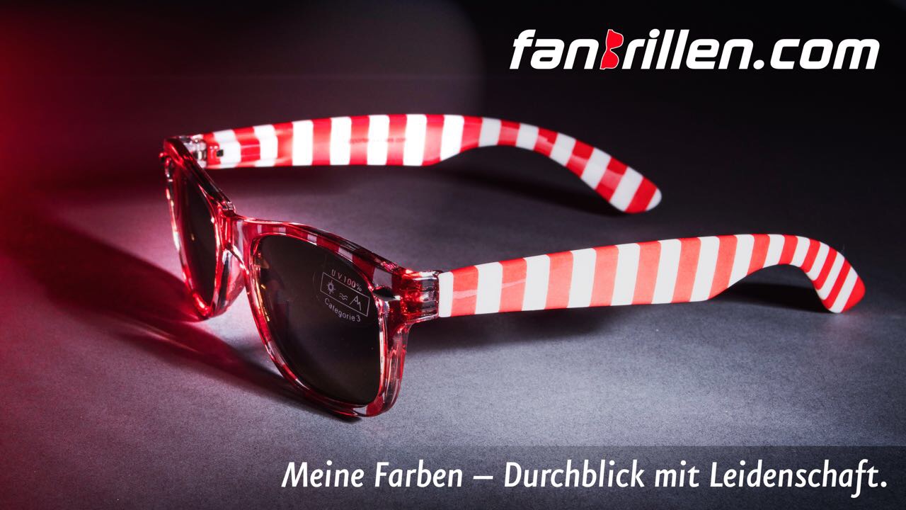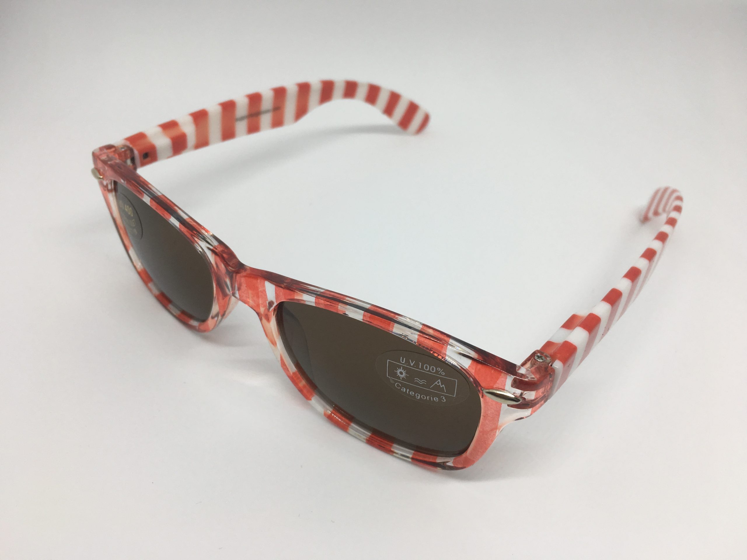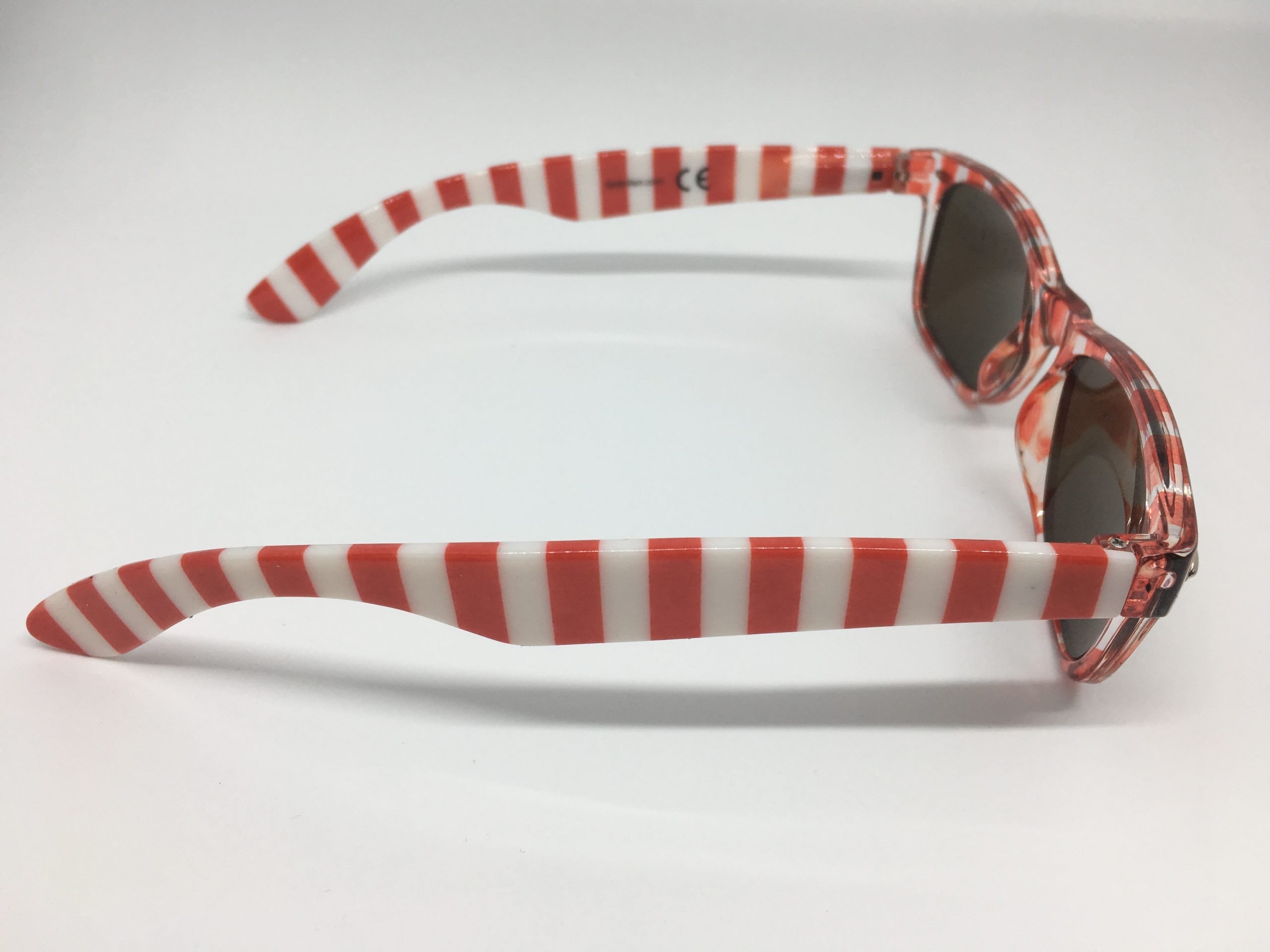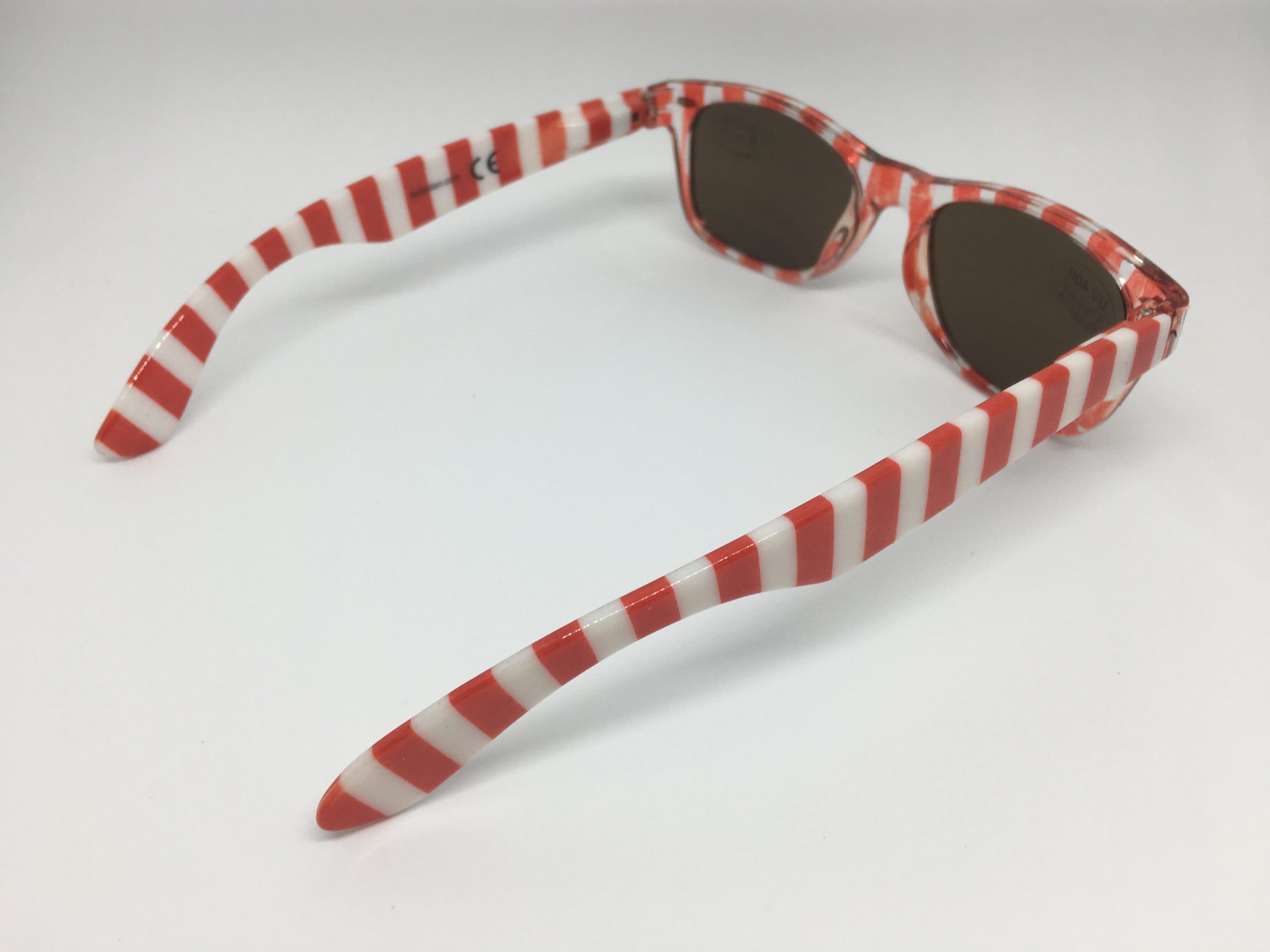 Hochwertige Sonnenbrille im Blockstreifen-Design in rot-weiß aus Kunststoff, erstklassig verarbeitet. Ausführung unisex. Lieferung inkl. Brillen-Beutel aus Mikrofaser im gleichen Design.