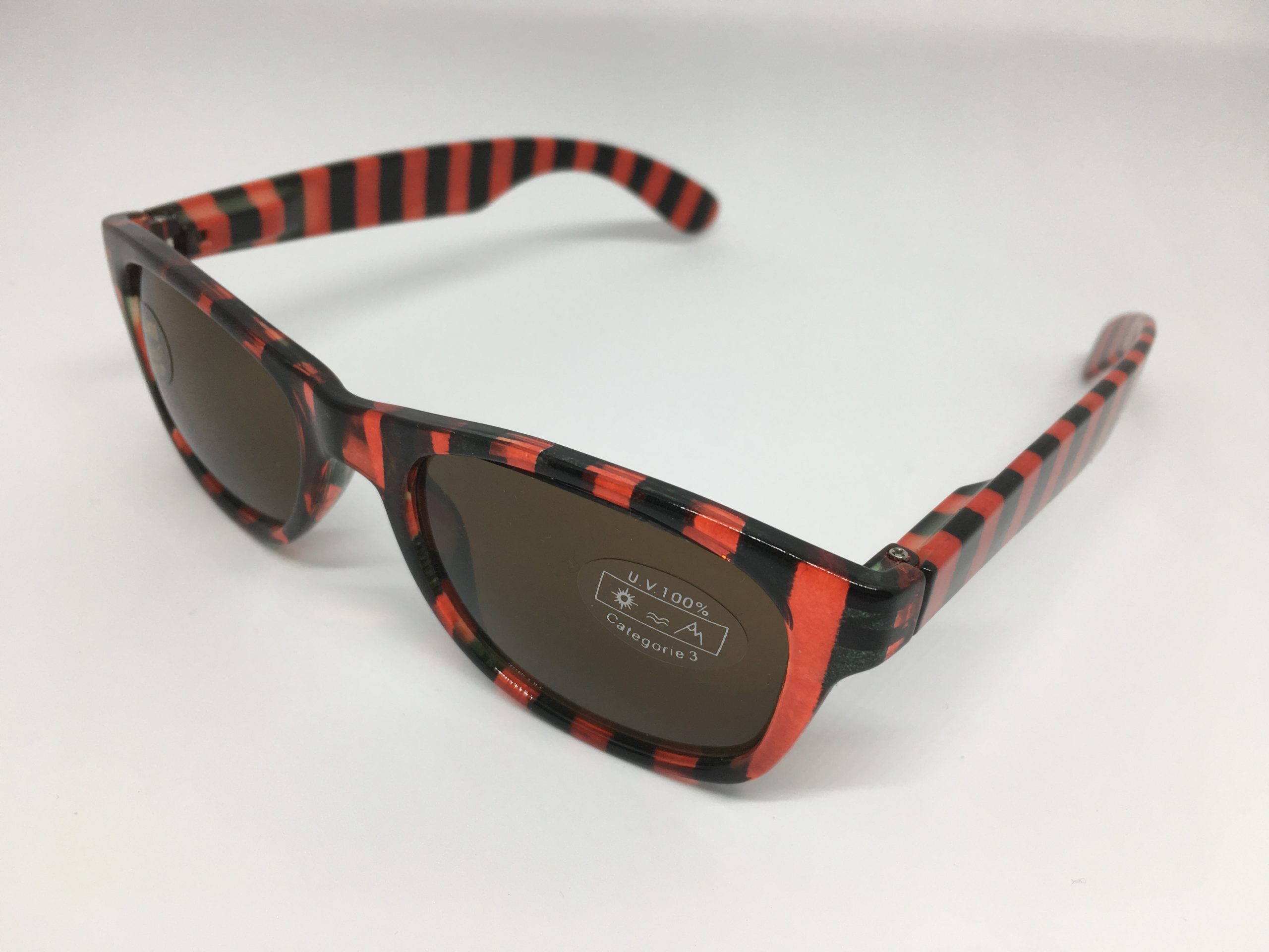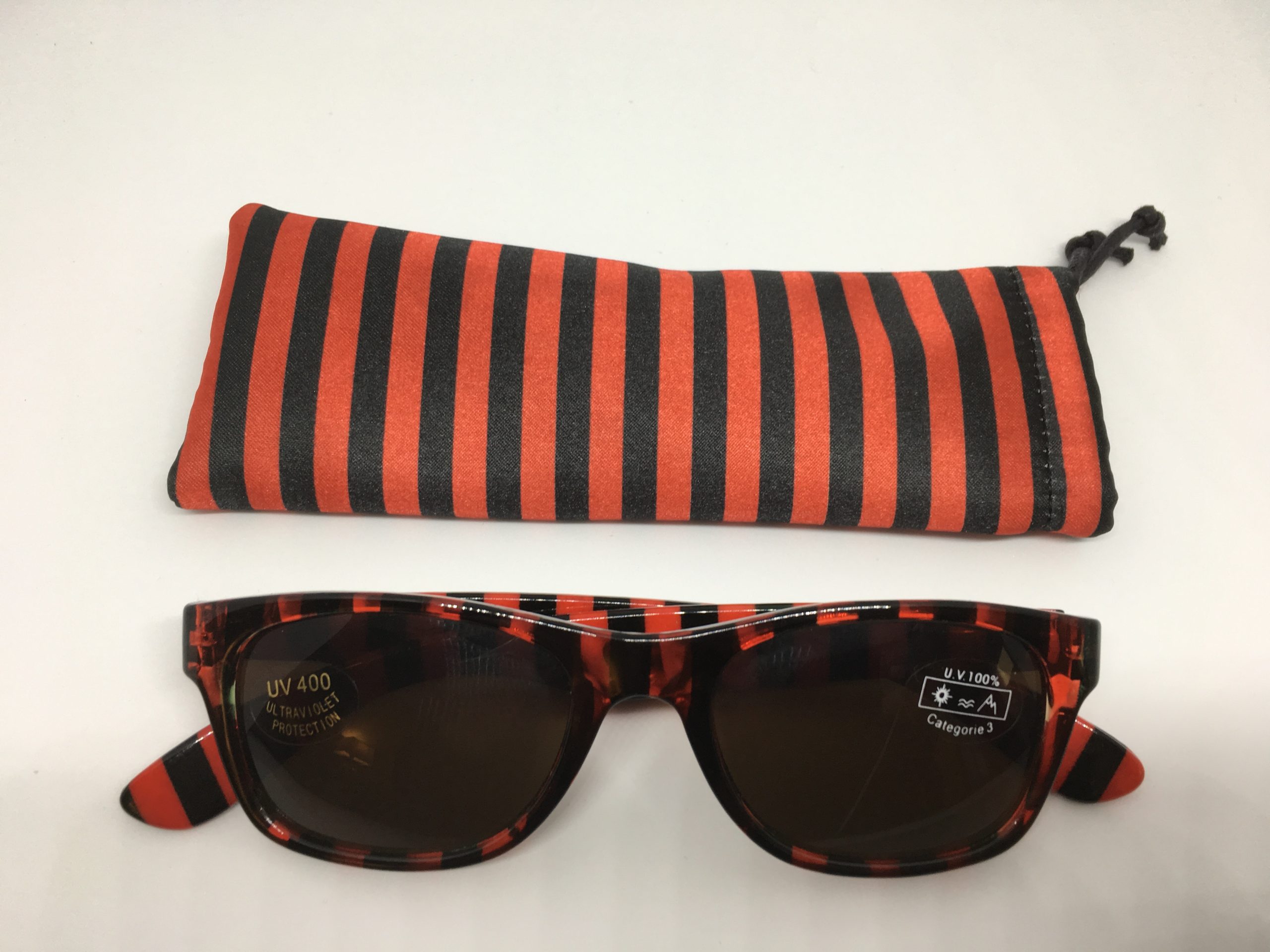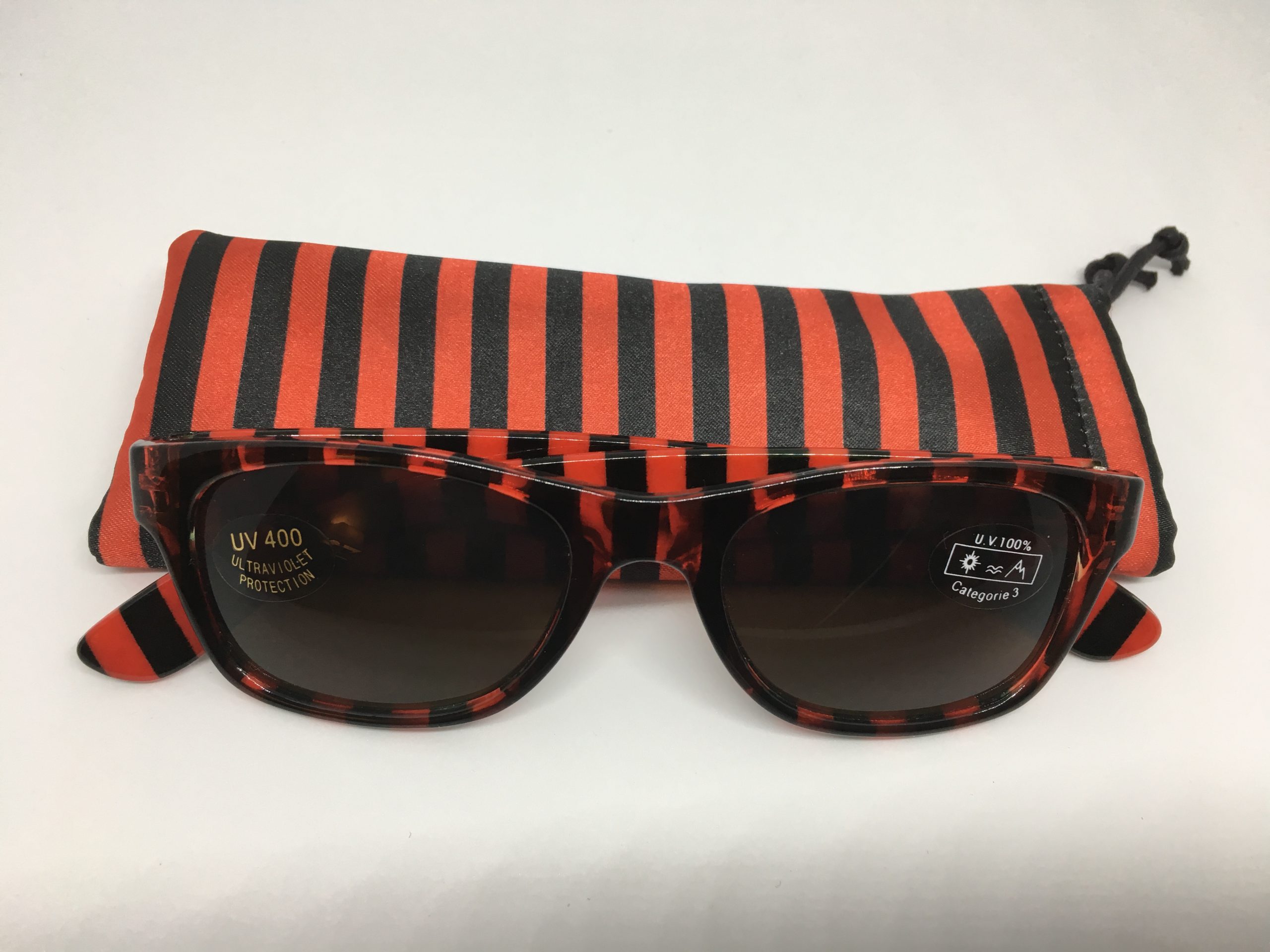Hochwertige Sonnenbrille im Blockstreifen-Design in schwarz-rot aus Kunststoff, erstklassig verarbeitet. Ausführung unisex. Lieferung inkl. Brillen-Beutel aus Mikrofaser im gleichen Design.