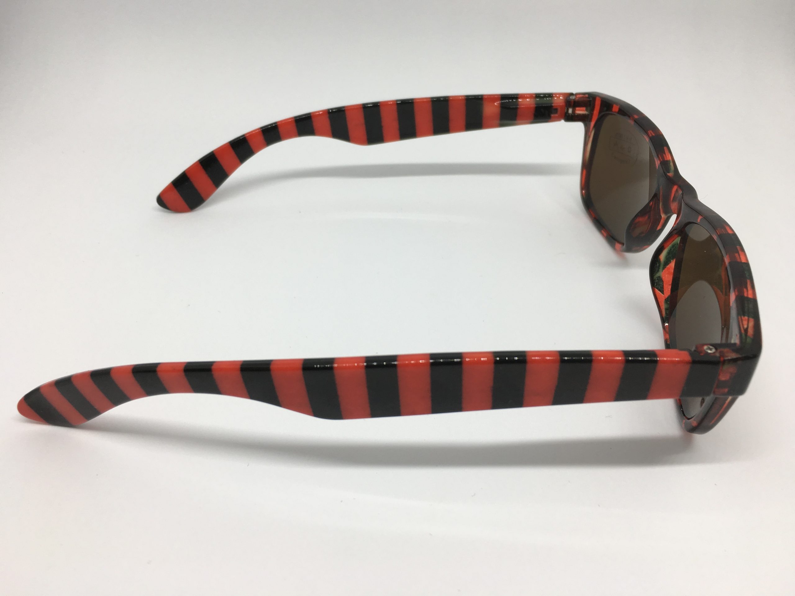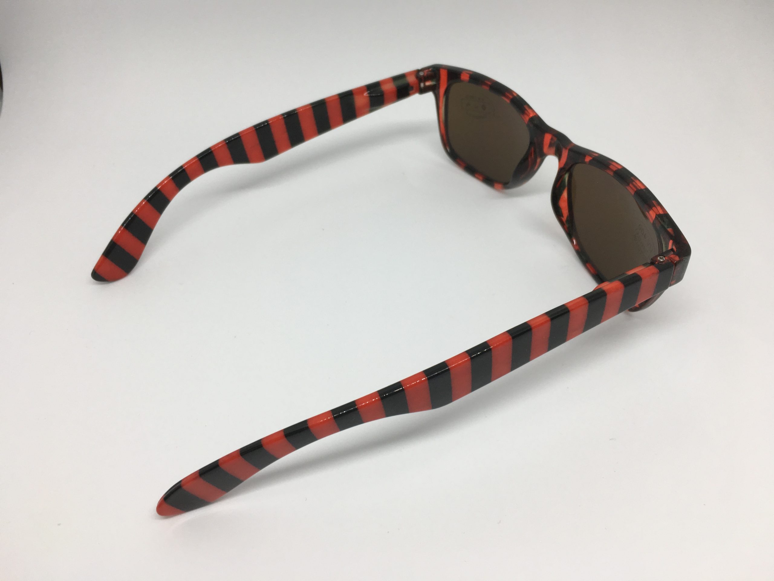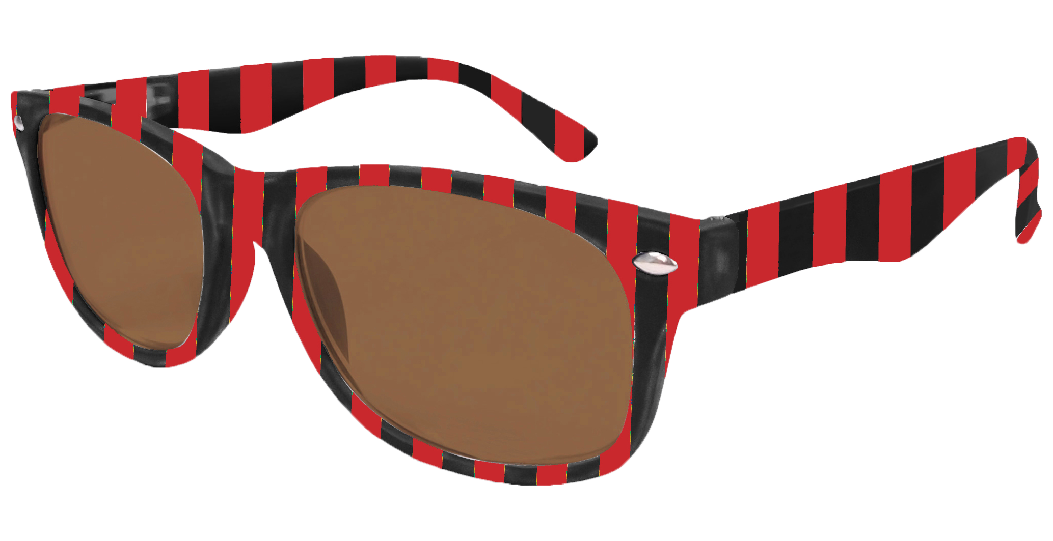 Hochwertige Sonnenbrille im Blockstreifen-Design in schwarz-rot aus Kunststoff, erstklassig verarbeitet. Ausführung unisex. Lieferung inkl. Brillen-Beutel aus Mikrofaser im gleichen Design.