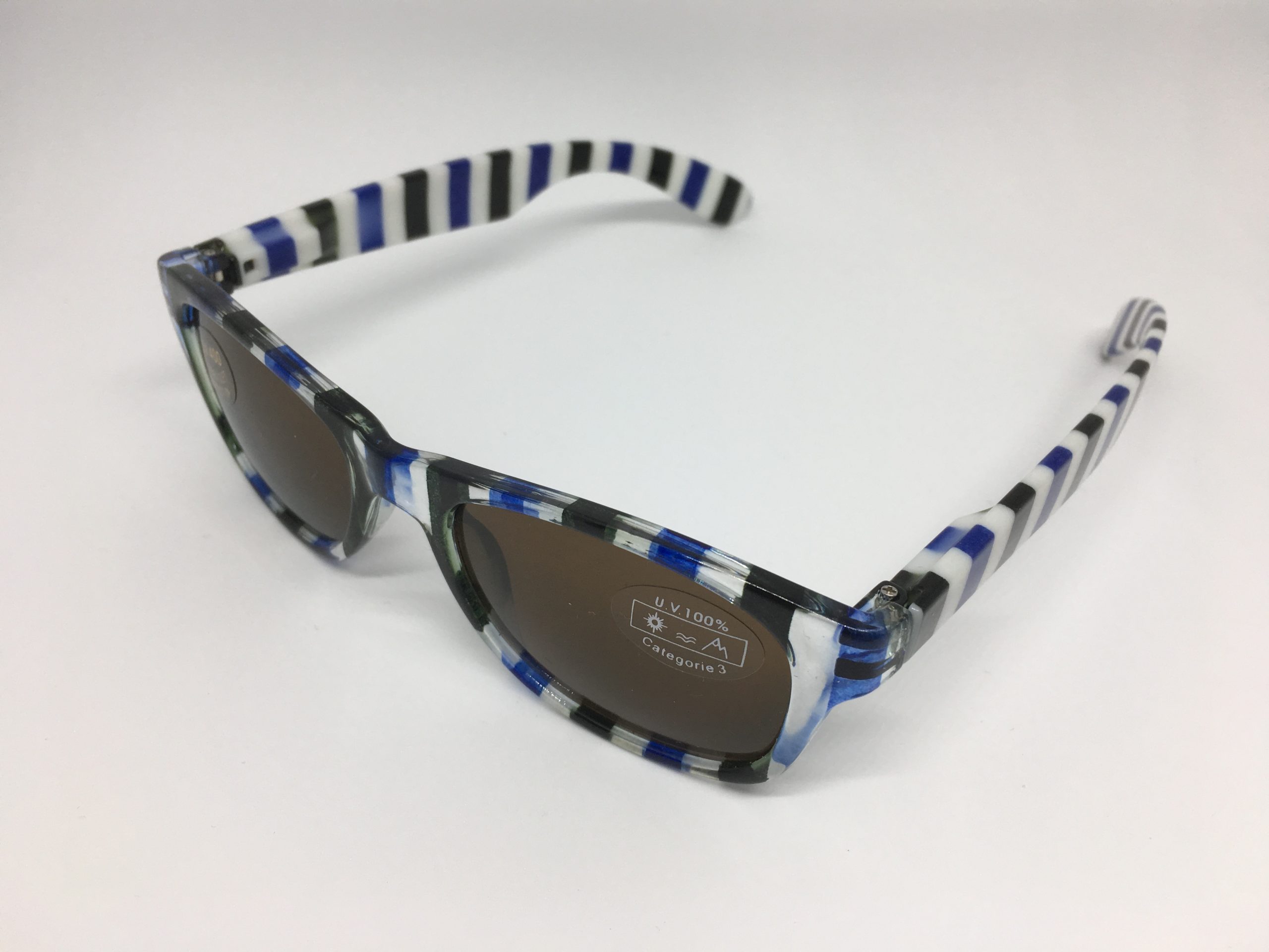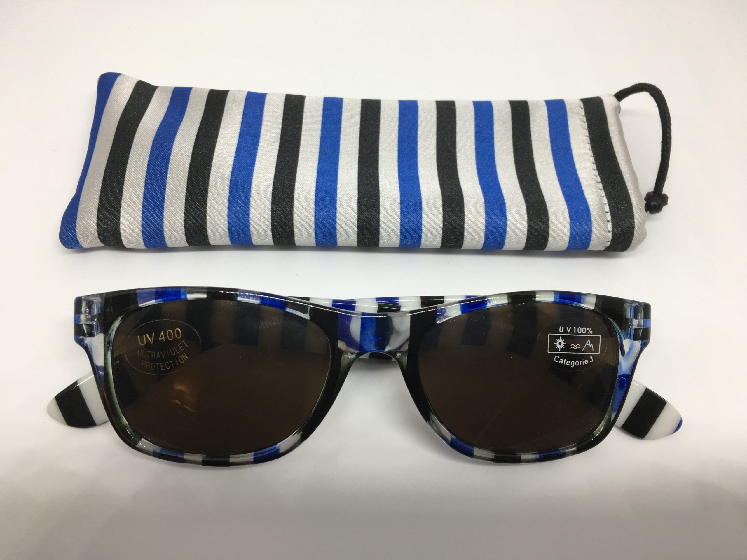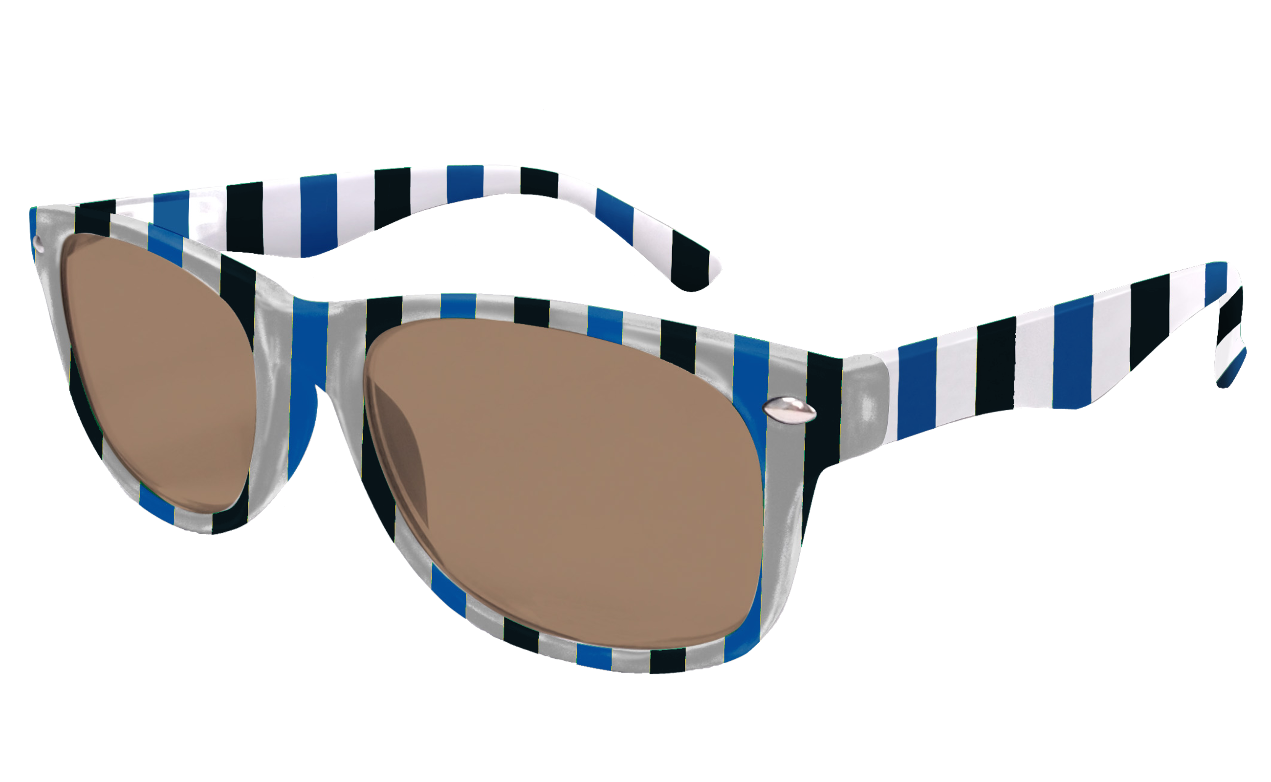 Hochwertige Sonnenbrille im Blockstreifen-Design in schwarz-weiß-blau aus Kunststoff, erstklassig verarbeitet. Ausführung unisex. Lieferung inkl. Brillen-Beutel aus Mikrofaser im gleichen Design.