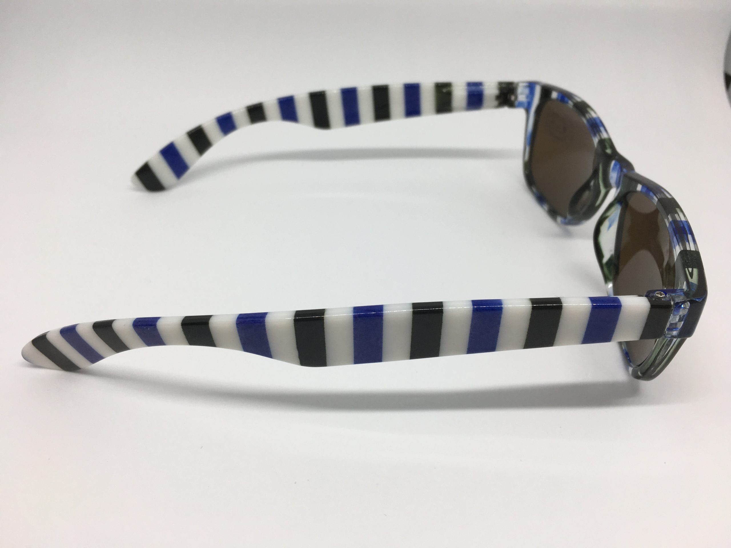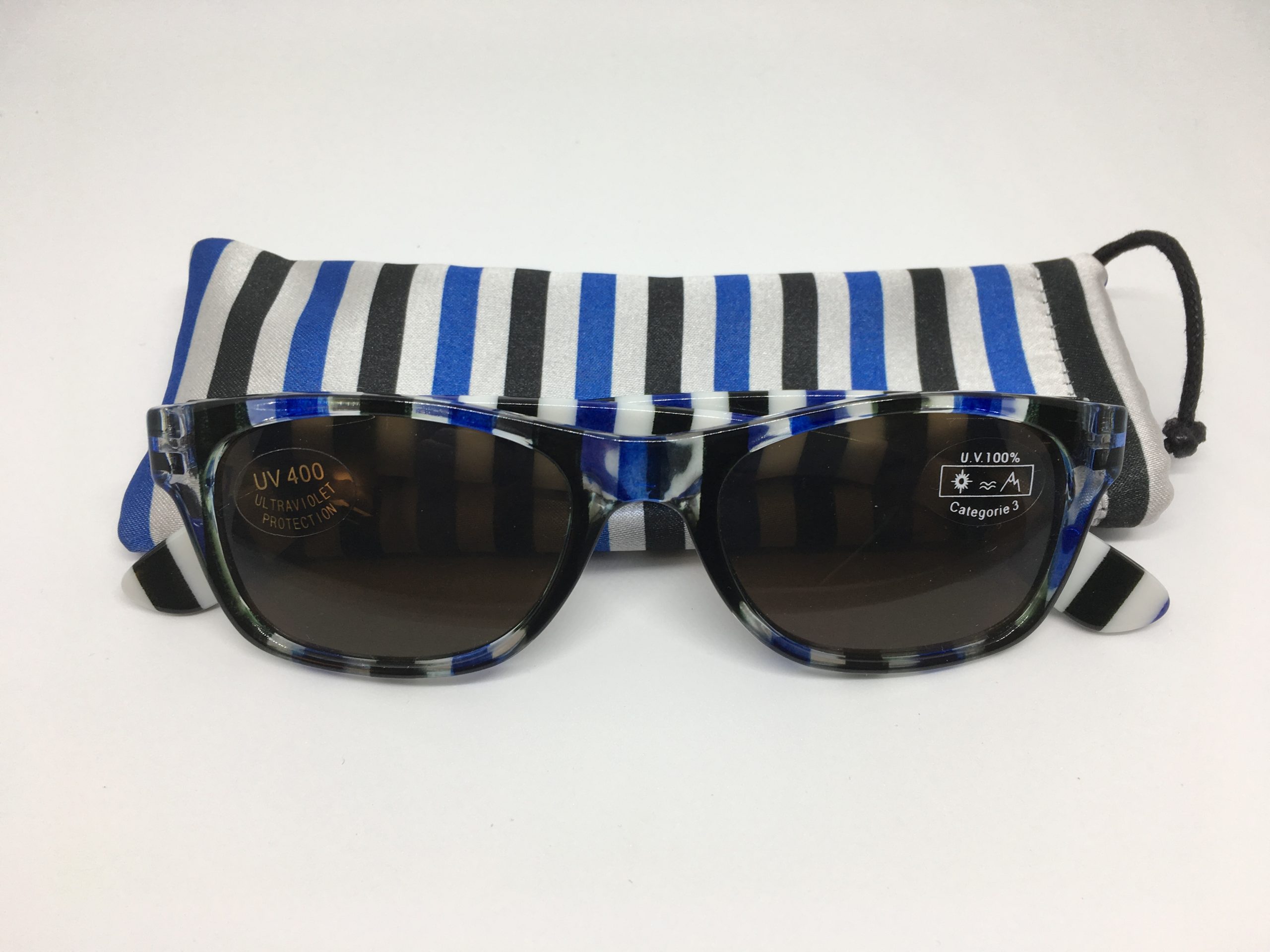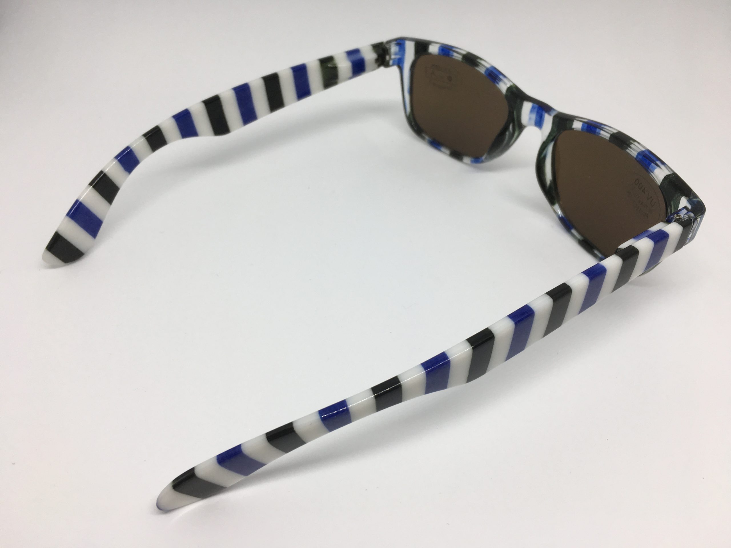 Hochwertige Sonnenbrille im Blockstreifen-Design in schwarz-weiß-blau aus Kunststoff, erstklassig verarbeitet. Ausführung unisex. Lieferung inkl. Brillen-Beutel aus Mikrofaser im gleichen Design.
