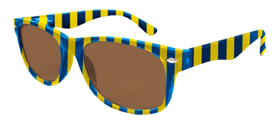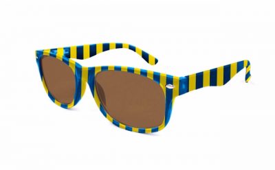 Stylische Sonnenbrille im Blockstreifen-Design in blau-gelb aus Kunststoff, hochwertig verarbeitet. Ausführung unisex. Lieferung inkl. Brillen-Beutel aus Mikrofaser im gleichen Design.
